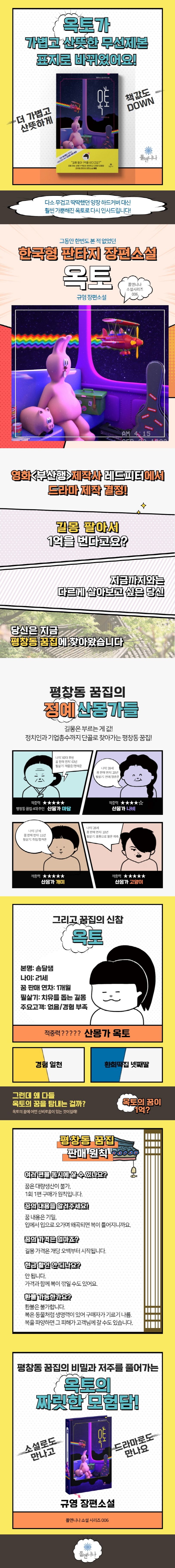 서점에 책을 입고하기도 전에 드라마 제작 결정이 먼저 났다. 영화 《부산행》을 만든 제작사 〈레드피터〉는 반짝이는 소재가 돋보이는 한국형 판타지 장편소설 《옥토》의 드라마 판권을 계약했다. 소설의 배경은 평창동. 계수나무와 별당과 토굴이 있는 꿈집이다. 지금까지와는 다르게 살아보고 싶다면, 우리는 이제 평창동 꿈집으로 가면 된다. 매몽업계 최고의 평창동 꿈집에는 정예 산몽가들이 다섯 명이나 있다. ‘산몽가’란 ‘꿈을 파는 사람’이다. 재물운은 산몽가 마담의 길몽이 으뜸이다. 그는 평창동 꿈집의 4대 주인이기도 하다. 천생연분을 만나려면 산몽가 나비의 길몽을, 취업은 산몽가 개미의 꿈을, 불행을 막으려면 산몽가 고양이의 꿈을 사면 된다. 그리고 산몽가 옥토. 이제 막 평창동 꿈집에 들어온 신참이다.