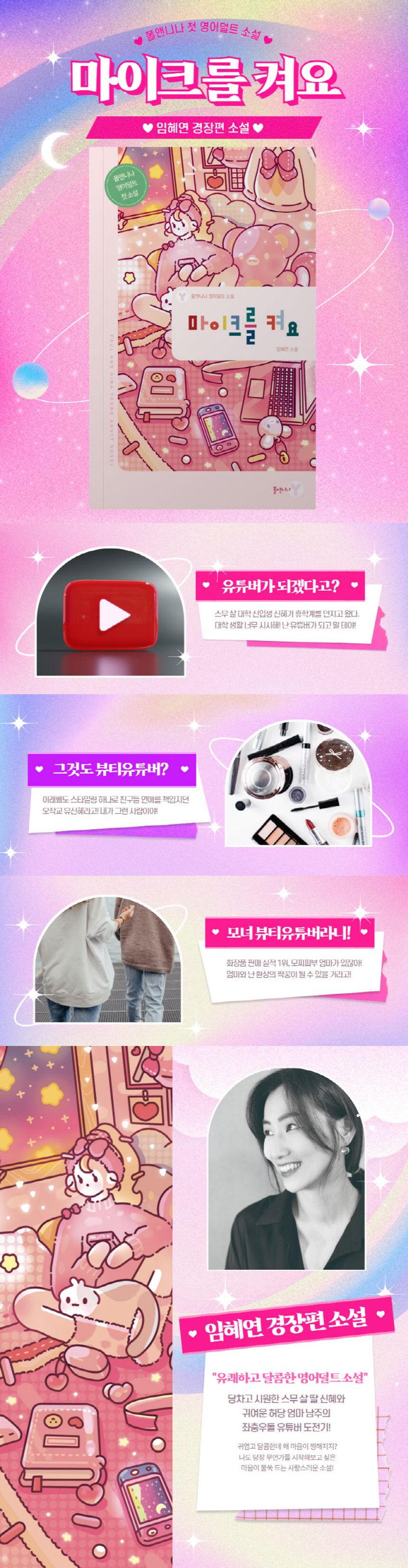 유신혜의 엄마, 리틀맘 출신 유남주가 허당인 것 같다고? 그건 오해다. 이래봬도 화장품매장 전 직원 중 인센티브 1위다. 타고난 관리 능력과 입담으로 고객의 마음을 사로잡을 줄 아는 남주는 신혜에게 이끌려 얼떨결에 뷰티유튜버로 합류하게 되는데, 중구난방 좌충우돌이지만 카메라 앞에서 모찌피부 자랑하며 쑥쑥 잘도 성장한다. 그러니까 이 소설 《마이크를 켜요》는 스무 살 딸과 마흔 살 엄마의 성장담이기도 하다. 신혜의 첫사랑 래퍼, MC 더키오가 벌이는 찌질한 짓에도, 저격 전문 유튜버 암행어사의 무시무시한 모략에도 신혜와 남주는 기어이 용맹해지는 것이 알고 보면 두 사람의 사랑스러운 티키타카 때문임을 독자는 눈치챌 것이다. 그래서 문득 가슴 뭉클해질 것이다.