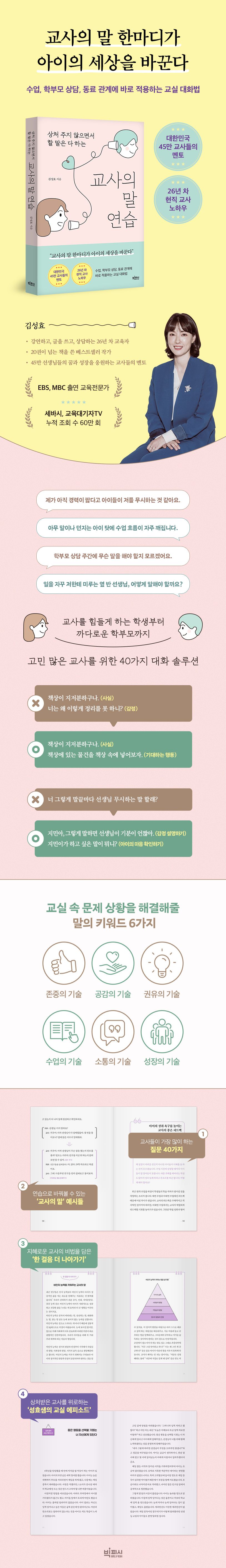 교사의 말은 힘이 세다. 아이들의 삶을 바꾸기도 하고, 자존감을 떨어뜨리는가 하면, 모든 어려움을 이겨낼 힘을 만들어주기도 한다. 이 책은 학생 지도, 학부모 상담, 동료 관계 등 교직 생활을 힘들게 만드는 다양한 문제 상황에서 교사가 어떻게 말해야 원하는 결과를 얻어낼 수 있는지를 실제 사례를 들어 이야기한다.