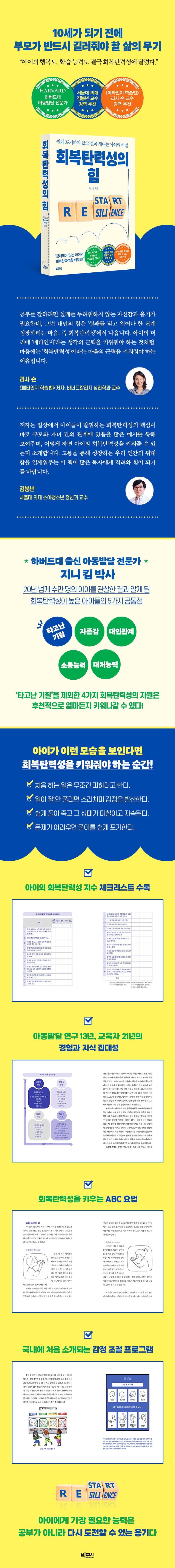 쉽게 포기하는 아이와 결국 해내는 아이의 차이는 어디에서 오는 것일까? 아동발달 전문가이자 교육자인 지니 킴(Jeanie Kim) 박사는 하버드대 재학 당시 진행한 프로젝트와 20년 넘게 미국의 교육 현장에서 만난 수만 명의 아이들을 통해 학습 능력이 뛰어나고 행복감이 높은 아이들은 모두 회복탄력성이 높다는 공통점을 발견했다. 이 아이들은 “실수해도 괜찮아, 다시 해보면 돼”라는 태도로 잘 안 풀리는 문제에도 끈기를 가지고 매달리며, 결과가 좋지 않을 때도 좌절감에 휘둘리지 않았다. 저자는 이 책에서 회복탄력성은 모두 갖고 태어나고, 어려서부터 반복과 연습을 통해 누구나 기를 수 있다고 강조하며, 긍정성, 자기 신뢰, 자기조절능력 같은 회복탄력성의 자원을 아이의 삶에 뿌리내리게 하는 방법들을 구체적으로 안내한다.