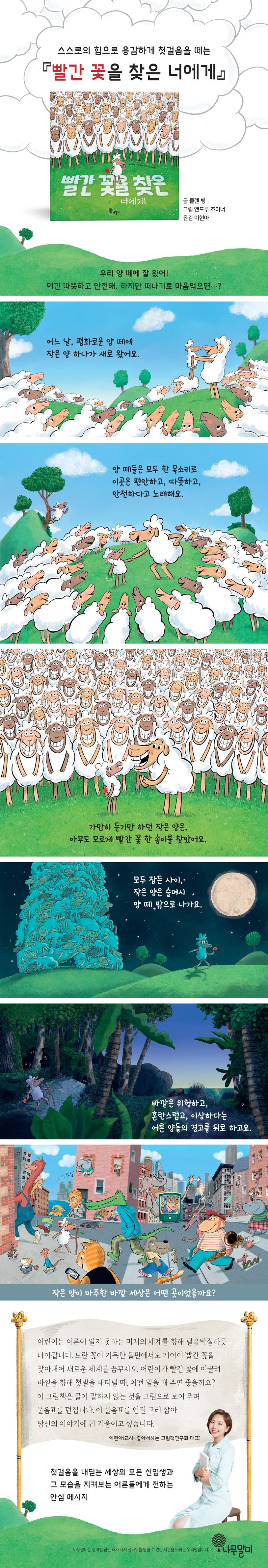 그 얘기들을 가만히 듣기만 하던 어린 양은, 아무도 신경 쓰지 않는 사이에 빨간 꽃 한 송이를 발견합니다. 양 떼는 누구나 초록 풀과 노란 꽃을 먹는데 말이죠.