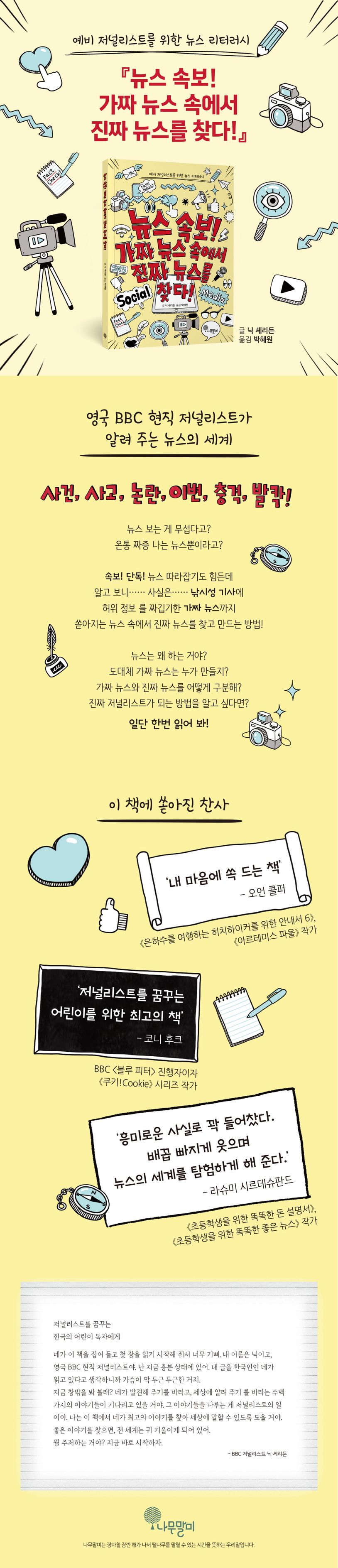 뉴스의 탄생과 역사, 가짜 뉴스 속에서 진짜 뉴스를 찾고 만드는 방법, 진짜 저널리스트가 되는 방법을 알고 싶다고요? 일단 한번 읽어 보세요! 이 책이 뉴스에 대한 모든 걸 알려 줄 거니까요!