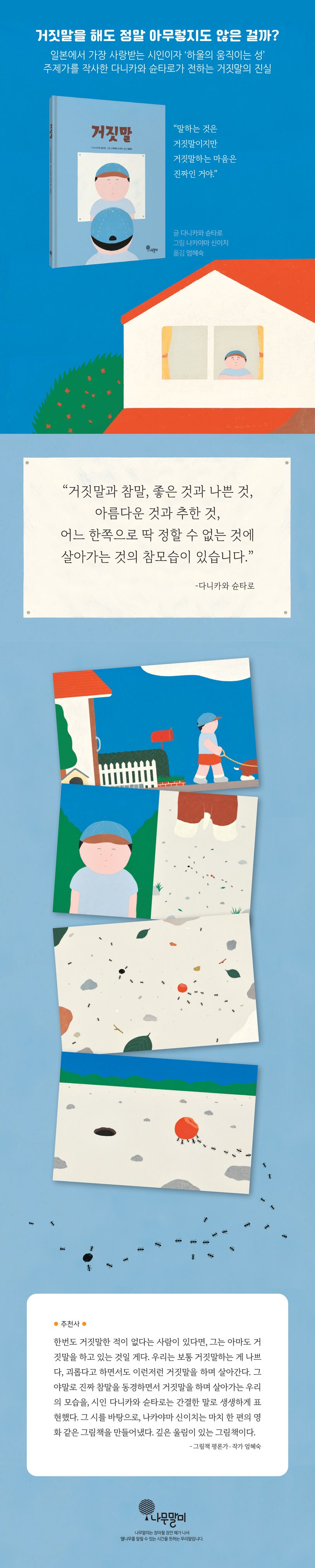이 그림책은 시인 다니카와 슌타로가 거짓말에 대해 노래한 시 「거짓말」에 일러스트레이터 나카야마 신이치가 그림을 그려 탄생했습니다. 그림책을 펼치면 한 아이의 산책길과 그 아이의 속마음처럼 들리는 시를 통해 거짓말과 참말에 대해 많은 생각을 하게 됩니다. 그리고 누구나 갖고 있을법한 감추고 싶은 마음속 깊은 곳까지 닿아, 가끔씩 다시 읽고 싶어지는 보물 같은 그림책입니다.