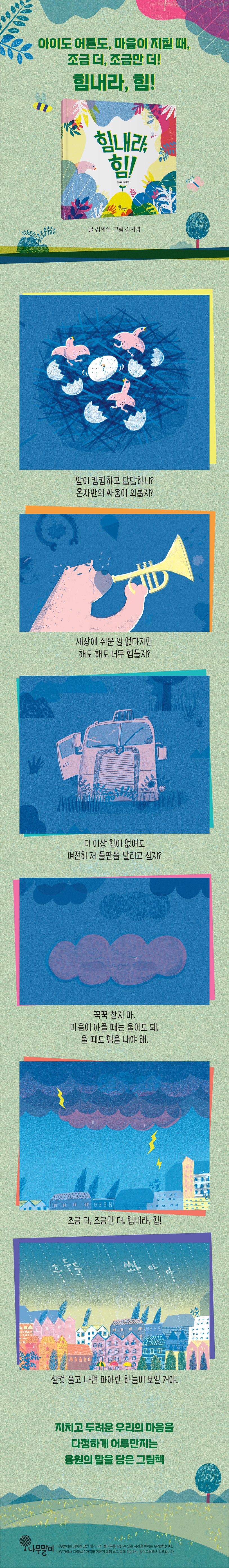 아이도 어른도 누구나 이런 때가 있다. 앞이 캄캄하고 답답할 때, 혼자만의 싸움이 외롭게 느껴질 때, 세상 쉬운 일이 없고 꽉 막힌 기분일 때, 마음이 아픈데도 꾹꾹 눈물을 참을 때. 이렇게 마음이 지쳐있을 때도 누구나 마음속에 작은 ‘힘’을 품고 있다. 그럴 때 내 안의 작은 힘이 조용히 속삭인다. “조금 더, 조금만 더 - 힘내라, 힘!”, "괜찮아. 넌 할 수 있어. 힘내라, 힘!"