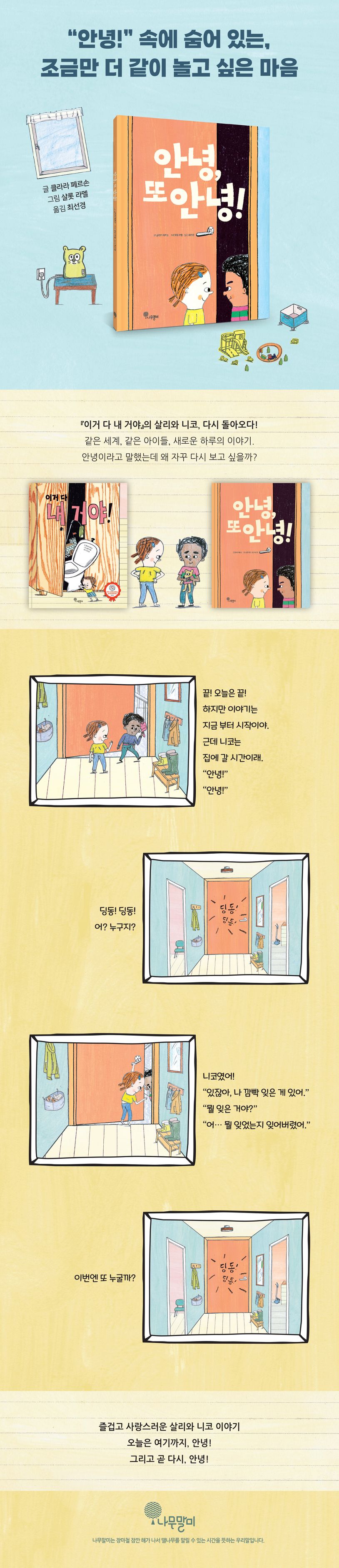 귀염둥이 살리와 니코가 돌아왔습니다. 첫 번째 그림책 『이거 다 내 거야!』에서 니코를 기다리면서도 장난감을 옷장에 숨기던 살리의 이야기가 중심이었다면, 이번 그림책에서는 살리랑 노는 게 마냥 좋은 니코가 헤어지고도 자꾸만 다시 찾아오는 이야기입니다. 헤어지고 다시 찾아와 같이 노는 이야기가 반복되며 그 속에서 아이들의 마음이 아주 솔직하게 드러납니다. “헤어져도 또 만나고 싶은 마음”을 담은 그림책입니다.