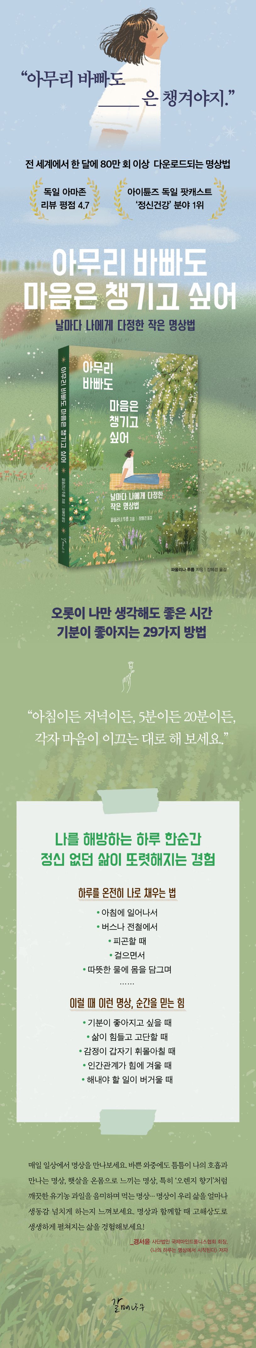 명상법만으로 아이튠즈 독일 팟캐스트 ‘정신건강’ 분야 1위를 차지한 파울리나 투름은 이 책에서 언제 어디서나 간결하게 명상할 수 있는 29가지 방법을 제안한다. 저자의 말에 따르면 우리는 아침에 눈 뜨자마자, 출근길에도, 목욕 중에도 명상할 수 있다. 명상의 핵심은 다른 특별한 것이 아니라 우리 마음에 귀 기울이는 일 그 자체이기 때문이다.