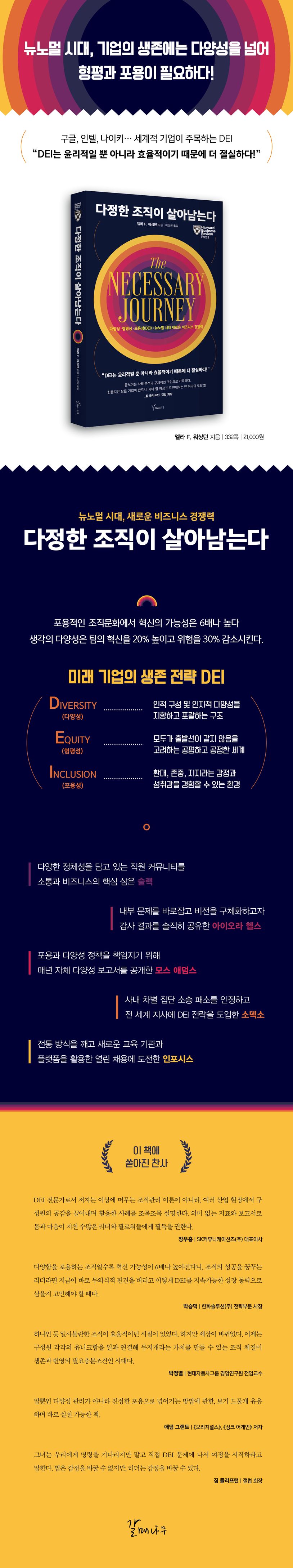 저자는 DEI를 ‘가야 할 여정(Necessary Journey)’이라고 표현한다. 아직 가보지 않은 그 길을 구체화하는 과정에서 제기된 수많은 질문에 답하고자 평생의 DEI 연구를 집대성해 이 책을 썼다. 그 여정의 출발점부터 시작해 여러 어려움을 겪으면서, 실패와 성공의 경험을 겹겹이 쌓아온 9개 기업의 이야기를 모았다. ‘인식’, ‘순응,’ ‘전술,’ ‘통합,’ ‘지속’의 다섯 단계로 나누어 분석하며, 단계별 도전과제와 실제 해결 사례를 소개한다. 기업마다 환경과 조직 특성 및 형편에 따라 자신만의 DEI 전략을 구축해야 하는 게 현실이다. DEI 앞에서 막막함을 느끼고 머뭇거렸던 리더라면, 현 위치를 점검하고 다음 단계로 나아가기 위해서 무엇이 필요한지 구체적인 로드맵을 참고하며 도움받을 수 있을 것이다.
