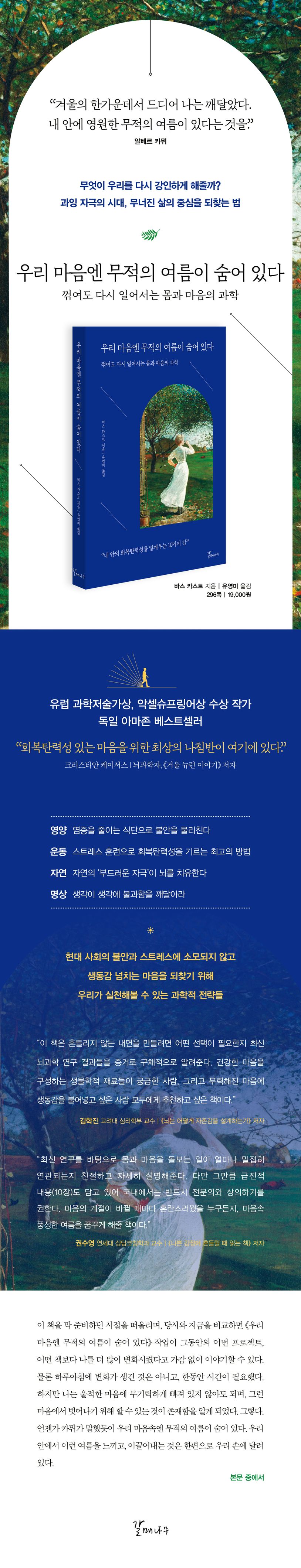 우리 마음은 왜 때로 힘든 걸까? 첫 번째 이유는 사람들 대다수가 ‘지금 여기’를 충실하게 사는 대신 미래에 대한 가정과 불안에 얽매여 살아간다는 점이다. 업무나 인간관계, 경제 상황 등에 관한 걱정은 당연히 우리를 지치고 불안하게 만든다. 두 번째이자 보다 근본적인 이유는 현대인의 생활 환경 자체가 신체에 불균형을 일으켜 만성적인 염증과 우울을 유발한다는 점이다. 특히 온갖 자극이 넘쳐나는 대도시의 환경은 뇌의 주의력을 소모시킨다. 다행히 우리는 몇 가지 방법을 통해 이러한 위험 요소를 이겨내고 생동감 넘치는 마음을 되찾을 수 있다. 알베르 카뮈가 말했듯이 우리의 내면에는 결코 시들지 않는 무적의 여름이 있다. 외부 상황의 부침과 관계없이 생동감 넘치는 마음을 유지할 회복탄력성이 잠재된 것이다.