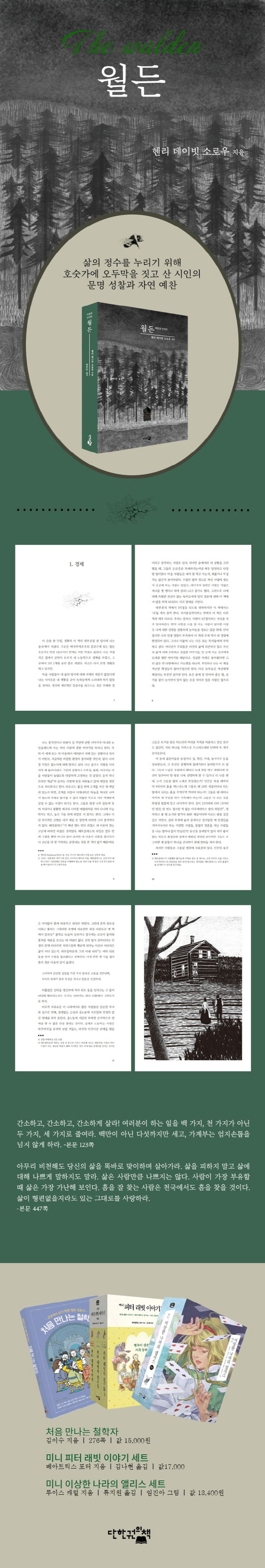 《월든》은 미국에서 대학생이라면 누구나 읽어야 할 필독서로 선정되어 온 책으로, 헨리 데이비드 소로우가 1845년 7월부터 1847년 9월까지 2년 2개월 남짓 동안 미국 매사추세츠 주 콩코드 근처 월든 호숫가에 오두막을 짓고 홀로 자급자족을 하며 지냈던 경험을 바탕으로 쓴 책이다.