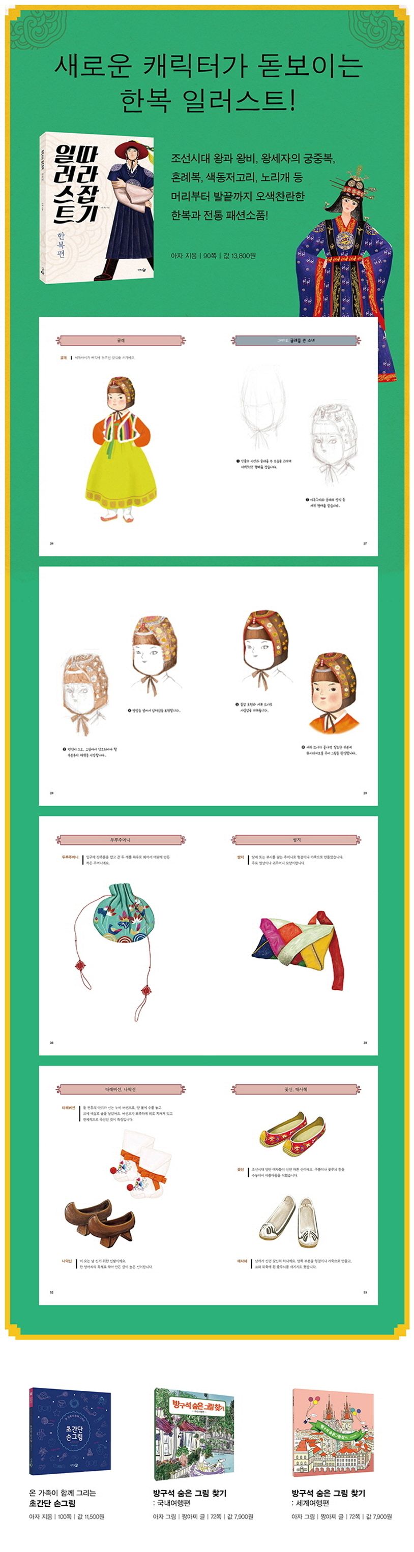이런 시대적 흐름은 자연스럽게 한복에 대한 관심으로 이어지고 있다. 세계인의 관심에 호응하고 한복을 세계무대에 알리기 위해서는 요즘 트렌드에 맞게 다양한 변형과 새로운 창작이 시도되어야 한다. 이 책은 그런 필요성에 의해 한복을 좀 더 재미있고 현대적인 콘셉트로 재해석해서 따라 그려보도록 기획되었다. 천편일률적인 정적인 자세에서 벗어나 좀 더 재미있고 발랄한 자세로 한복의 곡선미와 화려함을 더욱 부각시켜보고자 노력했다. 또한 등장인물에 다양한 표정을 입혀 더욱 에너지 넘치고 생기 있는 일러스트 책이 되도록 심혈을 기울였다. 알다시피 조선시대는 신분제 사회였다. 각각의 신분에 따른 다양한 계층의 남녀노소가 입었던 의상과 장신구, 패션소품 등을 실어 조선시대의 생활상을 종합적으로 살펴보고 따라 그릴 수 있도록 했다. 디자이너나 일러스트레이터 지망생, 우리 전통문화에 관심 있는 독자, 한복의 매력을 간직하고 싶은 독자라면 누구나 한번쯤 찾아볼 만한 책이다.