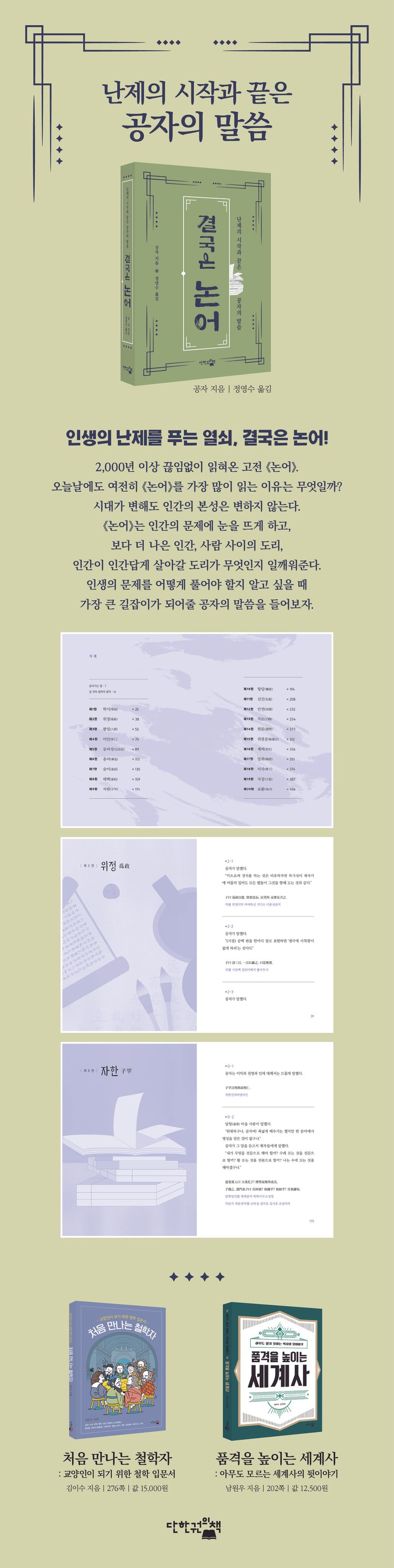 중국 북송시대의 철학자 정이천은 《논어》를 읽고 아무런 감흥도 느끼지 못하는 한 구절을 이해하고 기뻐하는 사람도 있으며, 전체를 온전히 다 이해해 자기도 모르게 손으로 춤을 추고 발로 뛰는 사람도 있다고 말했다. 이 책을 읽고 손과 발이 저절로 움직여 춤을 추고 뛰는 기쁨을 맛볼지, 아무런 감흥을 느끼지 못할지는 온전히 독자인 우리들의 몫일 것이다.