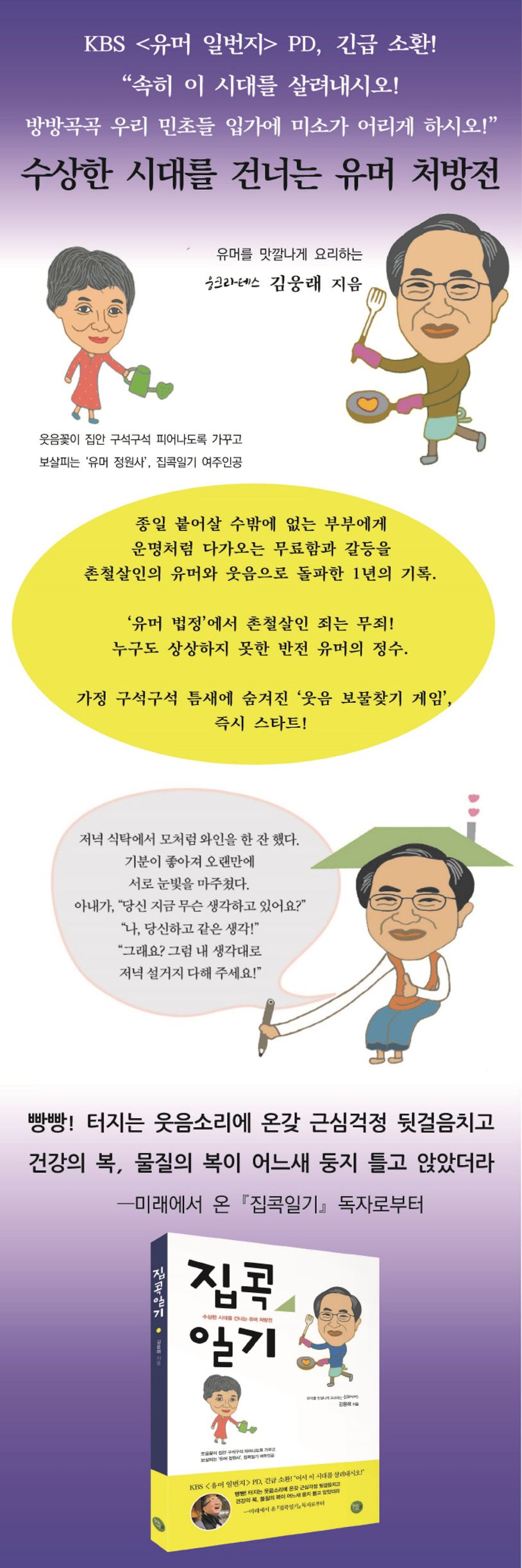 [집콕일기]는 종일 붙어살 수밖에 없는 부부에게 운명처럼 덮쳐오는 무료함과 갈등을 촌철살인의 유머와 웃음으로 돌파한 1년의 기록이다. KBS 인기 프로그램이었던 〈유머 1번지〉 등 코미디에 대한 깊은 애정으로 한국의 개그계를 주도했던 김웅래 PD가 매일 아침 7시 30분이면 페이스북에 올린 글을 정리한 책이다. 일상의 구석구석에 숨어 있는 유머 코드를 갈고 다듬은 그의 [집콕일기]는 하루 사이에 페친들 500여 분 이상이 ‘좋아요’와 아주 많은 댓글을 올릴 정도로 인기를 끌었다.