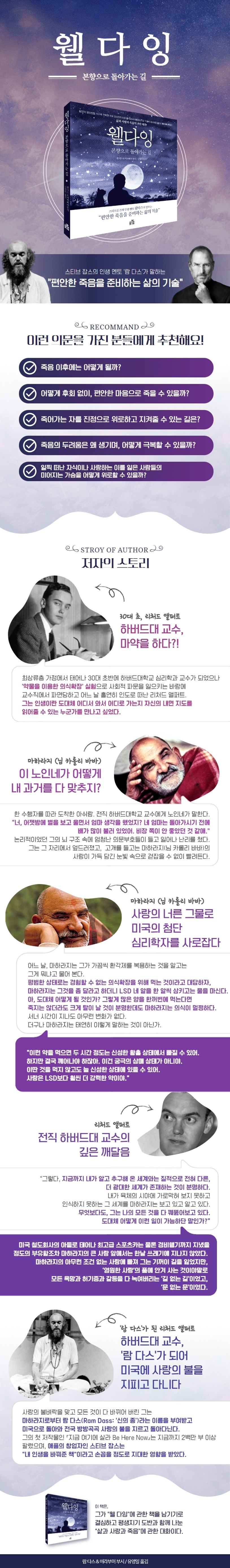이런 질문 앞에서 미국 정신계의 전설인 람 다스가 자신의 죽음을 눈앞에 둔 상태에서 자신이 온 생애를 통해 터득한 ‘지혜의 보물창고’를 열어 보인다. 그는 최상류층 가정에서 태어나 30대 초에 하버드대학교 심리학과 교수가 되었으나 환각제 효과를 통한 인간의 의식 확장 실험으로 사회적 파문을 일으켜 교수직에서 파문당하고 인도로 간다. 동양의 영성과 명상 전통에 충격을 받은 그는 ‘마하라지’로 더 잘 알려진 ‘님 카롤리 바바’를 만나 몸/마음을 넘어선 거대한 사랑의 물결을 체험하고 대변화를 경험하게 된다. ‘나’라는 존재는 ‘내가 생각하는 나’(에고)가 아니라 ‘사랑의 의식’ 곧 영혼이라는 것을 온 존재로 깨달은 것이다. 마하라지로부터 ‘신의 종’이라는 뜻을 지닌 람 다스라는 이름을 받고 미국으로 돌아온 그는, 동양의 영성과 요가를 대중화하는 초석이 된다. 애플 창업자 스티브 잡스가 ‘인생을 바꾸어 준 멘토’로 여겼을 만큼 미국 사회에 그가 끼친 영향은 깊고도 넓다.