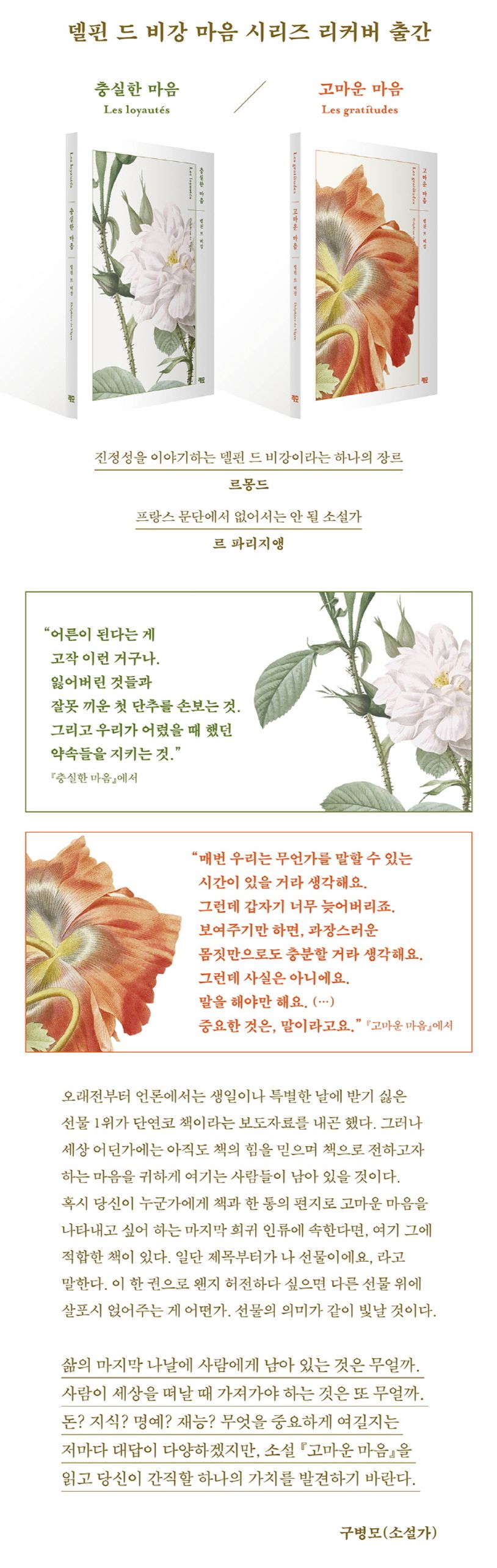 문학성과 대중성을 갖춘 동시대 최고의 프랑스 소설가 델핀 드 비강이 『충실한 마음』으로 돌아왔다. 델핀 드 비강은 2001년 『배고픔 없는 날들』로 데뷔한 이후, 두 권의 밀리언셀러 『길 위의 소녀』와 『내 어머니의 모든 것』을 비롯해서 총 8권의 소설로 프랑스 내에서만 3백만 부 이상의 판매고를 기록했으며, 전 세계 40여 개국에 번역 출간되었다. 더불어 르노도상, 고등학생이 뽑은 공쿠르상 등 유수의 문학상을 수상했다. 작가로서의 빼어난 이력을 갖춘 델핀 드 비강이 3년 만에 인간관계에 대한 짧은 소설 시리즈를 발표하며 전 세계 독자들의 주목을 받고 있다. 그 첫 번째 소설이 바로 2018년 1월 출간 두 달 만에 16만 부가 팔린 『충실한 마음』이다.