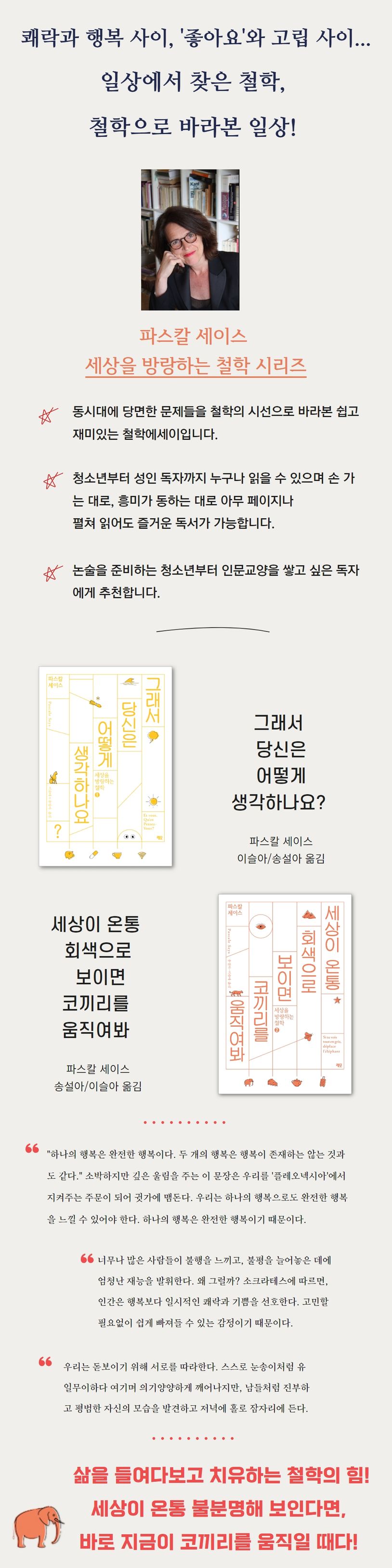 대학에서 철학과 미학을 강의하는 저자 파스칼 세이스가 라디오 채널 Musiq’3에서 진행한 〈주간 시사 칼럼(Les tics de l’actu)〉을 엮은 책. 1권 『그래서 당신은 어떻게 생각하나요?』로 시작해, 2권 『세상이 온통 회색으로 보이면 코끼리를 움직여봐』, 3권 『달팽이의 위엄』으로 이어지며 벨기에 독자들의 뜨거운 사랑을 받았다. 해당 방송은 페이스북에서만 200만 뷰 이상을 기록하며 철학의 대중화에 앞장섰다.