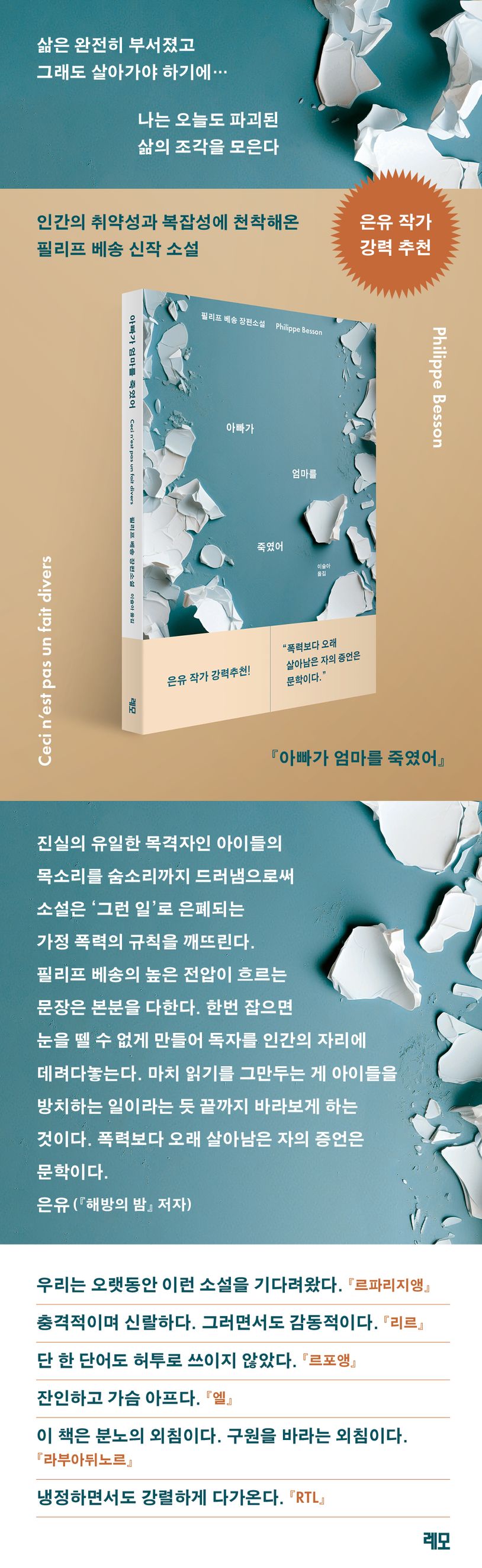‘여성살해(femicide)’의 전 과정을 낱낱이 해부하고, 그 참혹한 상처를 들여다보는 필리프 베송의 신작 『아빠가 엄마를 죽였어』가 레모에서 출간되었다. 가정 폭력 희생자들의 마지막을 재구성해낸 분노의 책이자, 오늘도 계속되는 ‘보이지 않는 폭력’을 향한 경고이고, 죄책감과 트라우마 속에 살아가야 하는 남은 사람들의 이야기이다.