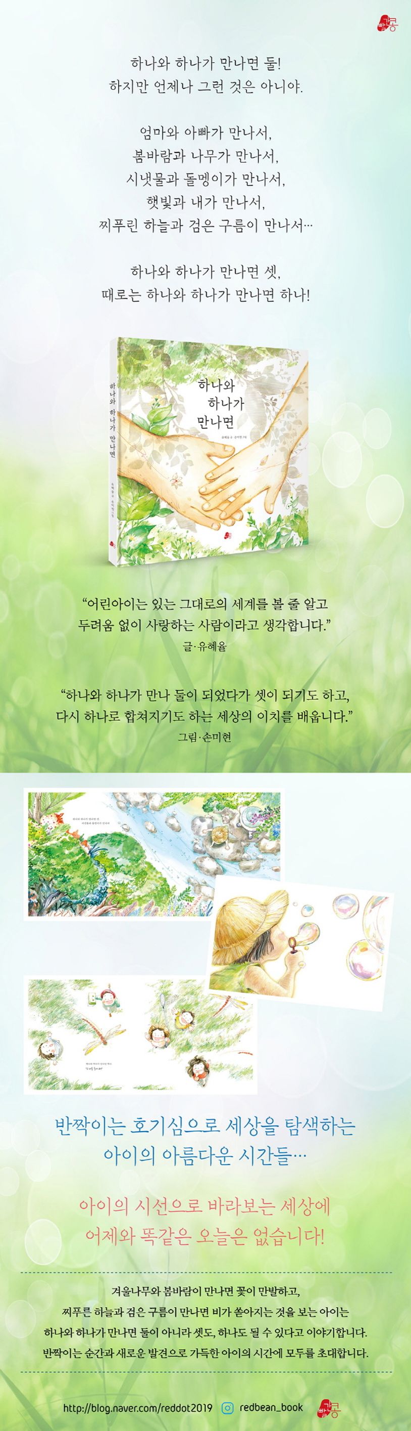 따뜻한 봄바람이 불기 시작할 무렵, 호기심 많은 아이는 세상을 탐색하며 또 다른 셈을 해나갑니다. 겨울나무와 봄바람이 만나서, 시냇물과 돌멩이가 만나서, 햇빛과 내가 만나서, 찌푸린 하늘과 검은 구름이 만나서 둘이 되기도 하고, 셋이 되기도 하고, 하나가 될 수도 있다고 이야기합니다. 내일은 또 어떤 하나와 하나가 만나게 될까요?
