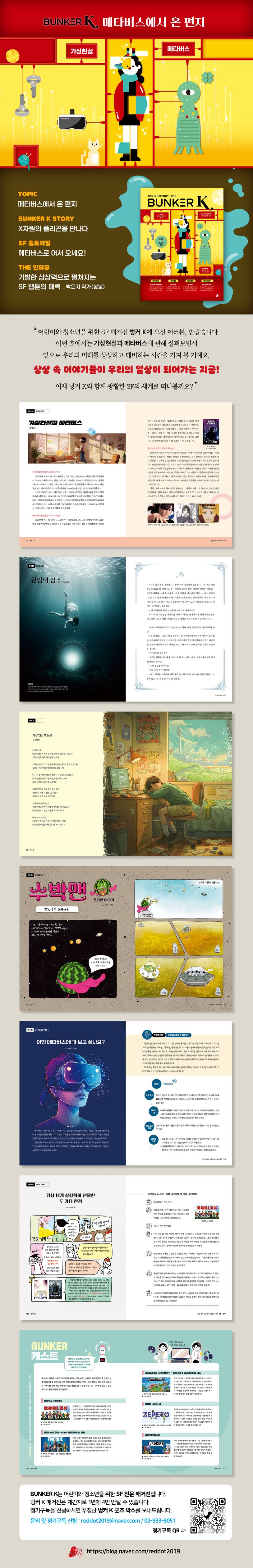 「벙커 101」에는 SF 속 가상현실과 메타버스에 대한 의미와 내용을 훑어보는 튜토리얼과 작품 소개, 『후궁공략』으로 2023년 SF어워드 만화·웹툰 부문 대상을 받은 작가 박은지(봉봉) 님과의 인터뷰를 실었습니다. 기발한 상상력으로 펼치는 SF 웹툰의 매력을 흠뻑 느껴보시기 바랍니다.