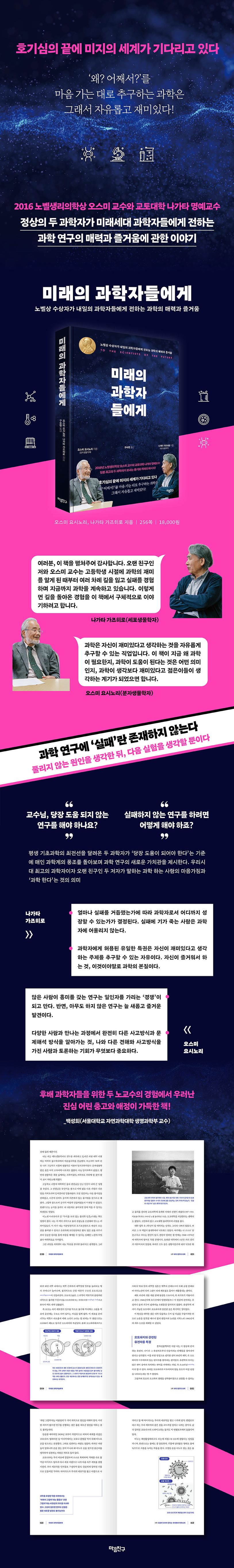 오토파지(자가포식) 연구로 2016년 노벨생리의학상을 수상한 오스미 요시노리 교수와 일본 최고의 명문 교토대의 나가타 가즈히로 명예교수. 정상의 두 과학자가 성공과 실패를 모두 포함한 자신들의 평생 연구 경험을 재미있는 일화와 함께 들려준다. 무엇보다 젊은 과학자들이 ‘당장 도움이 되어야 한다’는 압박에서 벗어나 마음 가는 대로 자신의 호기심을 추구하도록 격려한다. 과학의 내일을 짊어질 미래세대 과학자들에게 애정을 담아 전하는 ‘과학자가 된다’는 것의 매력과 ‘과학 한다’는 것의 의미.