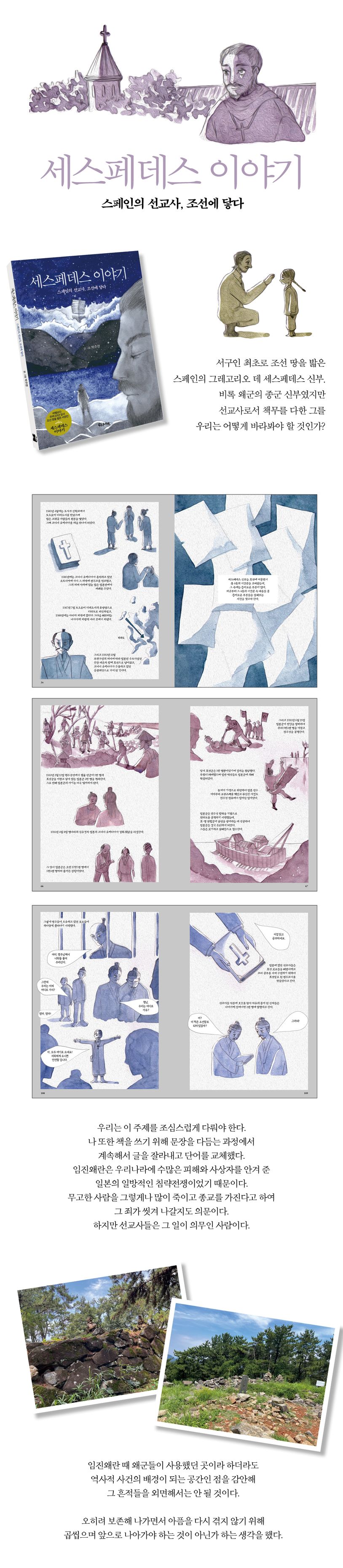 세스페데스 신부가 조선을 방문한 최초의 서양인이었다는 사실은 역사적으로 시사하는 바가 크다. 그는 선교 활동을 목적으로 최초로 조선 땅을 밟은 서구인이었으며 임진왜란의 참상을 기록한 그의 서간문은 귀중한 역사적 교훈을 일깨운다. 2023년은 세스페데스 신부가 한국 땅을 밟은 지 430년이 되는 해이다. 작가 박주현의 수채화로 탄생한 이 그래픽노블은 고향을 떠나 지역을 불사하고 선교사로서 자신의 역할에 충실했던 세스페데스 신부의 삶의 면모와 16세기 말 한국과 스페인의 운명적 만남을 아날로그적 감성을 더해 재조명하고 있다. 수채 물감이 종이에 스며들 듯, 단편적이고 편향된 지식에서 탈피한 당시 시대상과 인물들이 독자들의 마음에 입체적으로 되살아남과 동시에 잊혀진 또 하나의 우리 역사를 복원하는 데 일조하고픈 작가의 굳은 의지도 읽을 수 있을 것이다.