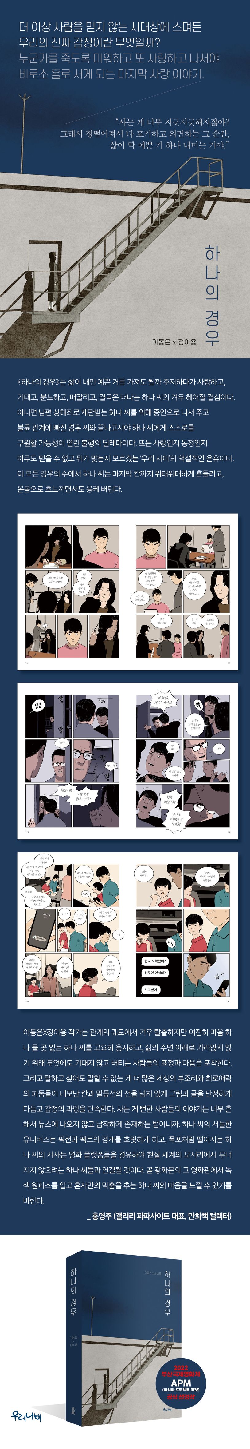 《하나의 경우》는 삶이 내민 예쁜 거를 가져도 될까 주저하다가 사랑하고, 기대고, 분노하고, 매달리고, 결국은 떠나는 하나 씨의 겨우 헤어질 결심이다. 아니면 남편 상해죄로 재판받는 하나 씨를 위해 증인으로 나서 주고 불륜 관계에 빠진 경우 씨와 끝나고서야 하나 씨에게 스스로를 구원할 가능성이 열린 불행의 딜레마이다. 또는 사랑인지 동정인지 아무도 믿을 수 없고 뭐가 맞는지 모르겠는 ‘우리 사이’의 역설적인 은유이다. 이 모든 경우의 수에서 하나 씨는 마지막 칸까지 위태위태하게 흔들리고, 온몸으로 흐느끼면서도 용케 버틴다.