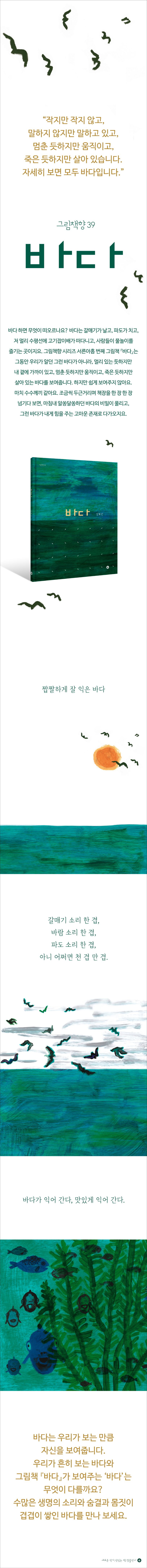 바다 하면 무엇이 떠오르나요? 바다는 갈매기가 날고, 파도가 치고, 저 멀리 수평선에 고기잡이배가 떠다니고, 사람들이 물놀이를 즐기는 곳이지요. 그림책향 시리즈 서른아홉 번째 그림책 『바다』는 그동안 우리가 알던 그런 바다가 아니라, 멀리 있는 듯하지만 내 곁에 가까이 있고, 멈춘 듯하지만 움직이고, 죽은 듯하지만 살아 있는 바다를 보여줍니다. 하지만 쉽게 보여주지 않아요. 마치 수수께끼 같아요. 조금씩 두근거리며 책장을 한 장 한 장 넘기다 보면, 마침내 알쏭달쏭하던 바다의 비밀이 풀리고, 그런 바다가 내게 힘을 주는 고마운 존재로 다가오지요.