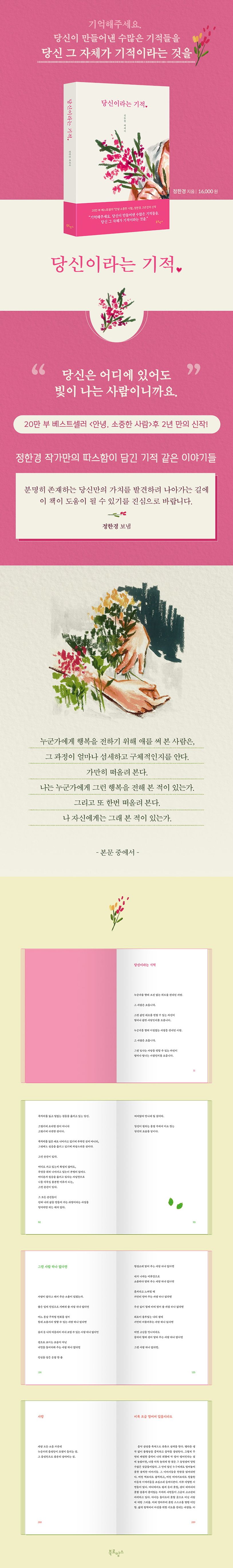 이별과 아픔의 시간들이 당신에게 남긴 것은 상처만이 아니었음을, 그 시간들을 지나며 당신은 결코 혼자가 아니었음을, 다가올 내일을 두려워하지 않아도 된다는 사실을 전하고픈 마음을 책에 꾹꾹 눌러 담았다. 평범한 듯 보이는 일상과 당연한 듯 느껴지는 관계 속에 담긴 삶의 가치들을 책을 통해 발견하다 보면 문득 알게 될 것이다. ‘당신’의 존재가 곧 기적임을.