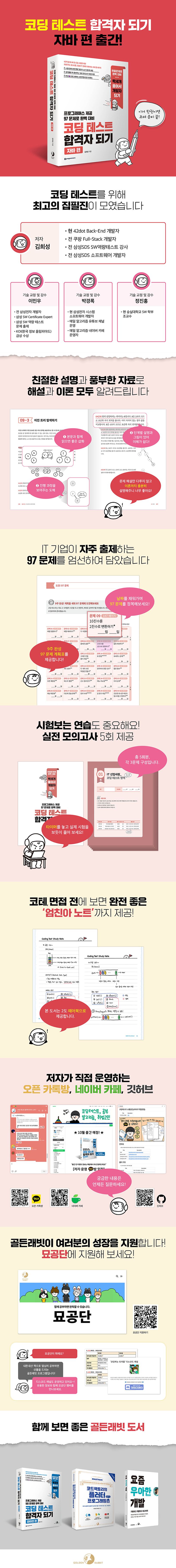 신입 사원 코딩 테스트를 준비하고 계신가요? 코딩 테스트는 문제만 열심히 푼다고 통과할 수 없습니다. 시험은 전략적으로 준비해야 합니다. 《코딩 테스트 합격자 되기》(자바 편)은 신입 사원 코딩 테스트 합격에 딱 맞는 빈출문제를 선정하고 풀이하기 위해 저자와 전문 교강사진이 오랜 시간을 들여 고민해 만들었습니다. 문제의 맥을 관통하는 자료구조와 알고리즘, 시간 복잡도 분석까지 완벽하게 풀이했죠! 모든 내용은 친절한 설명에 풍부한 그림을 더해 말끔하게 이해할 수 있도록 했습니다. 코딩 테스트뿐만 아니라 그 다음에 있을 면접까지 대비할 수 있을 것입니다. 이 책과 함께라면 합격은 여러분의 것입니다.