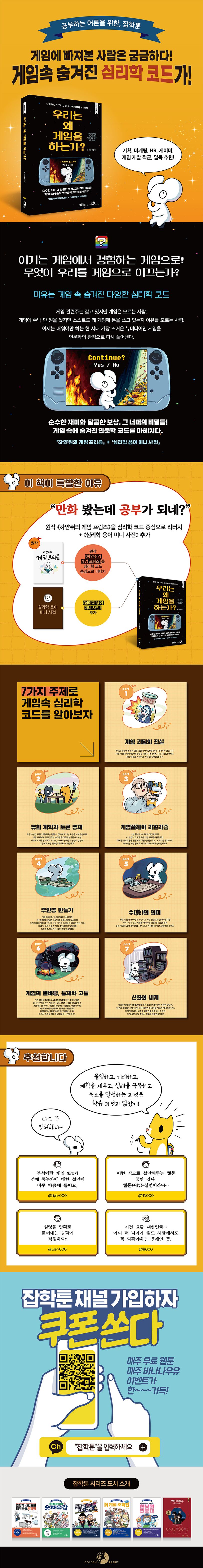 게임 관련주는 갖고 있지만 게임은 모르는 사람. 게임에 수백 만 원을 썼지만 스스로도 왜 게임에 돈을 쓰고 있는지 이유를 모르는 사람. 이제는 배워야만 하는 현 시대 가장 뜨거운 뉴미디어인 게임을 인문학과 심리학 관점으로 다시 풀어낸다. 이 책은 〈하얀쥐의 게임 프리즘〉 웹툰 원작을 ‘게임속 심리학 코드’를 주제로 리터치하고, 「심리학 용어 미니 사전」을 추가해 배우는 재미를 배가 했다. 〈젤다의 전설〉, 〈디아블로〉를 비롯한 30여 게임을 독자의 다양한 관점(게이머, 기획자, 개발자, 마케터)에서 만나보자.