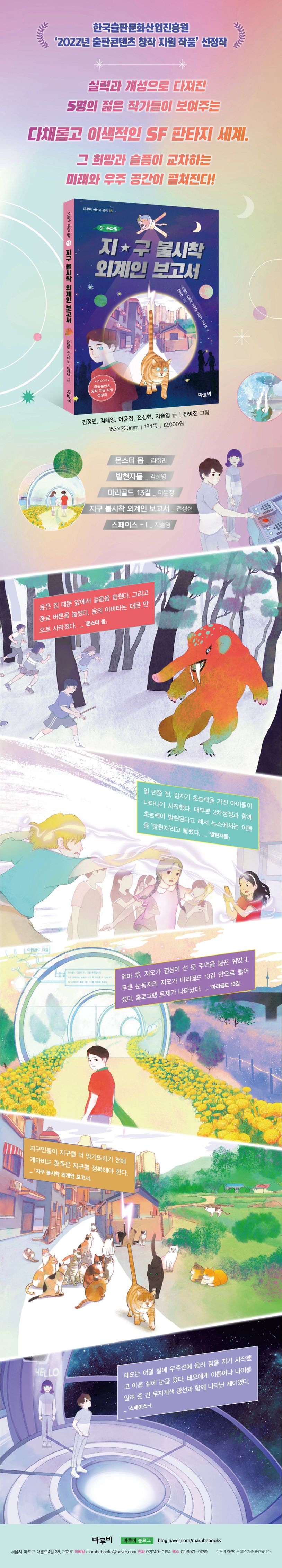 그동안 재미있고 유익한 어린이문학을 선보여 온 마루비 어린이문학 13번째 작품으로 새로운 구성의 SF 창작 동화집 《지구 불시착 외계인 보고서》가 출간되었습니다. 그동안 개성 넘치는 작품 활동으로 저마다 두터운 독차층을 확보하고 있는 5명의 작가들에 의해 탄생한 《지구 불시착 외계인 보고서》는 우주와 미래를 바라보는 시각 역시 이야기 한 편 한 편마다 전혀 다른 소재와 주제를 담고 있어 지금껏 느끼지 못한 SF 문학의 재미는 물론 가슴 뭉클한 메시지를 선사하게 될 것입니다.