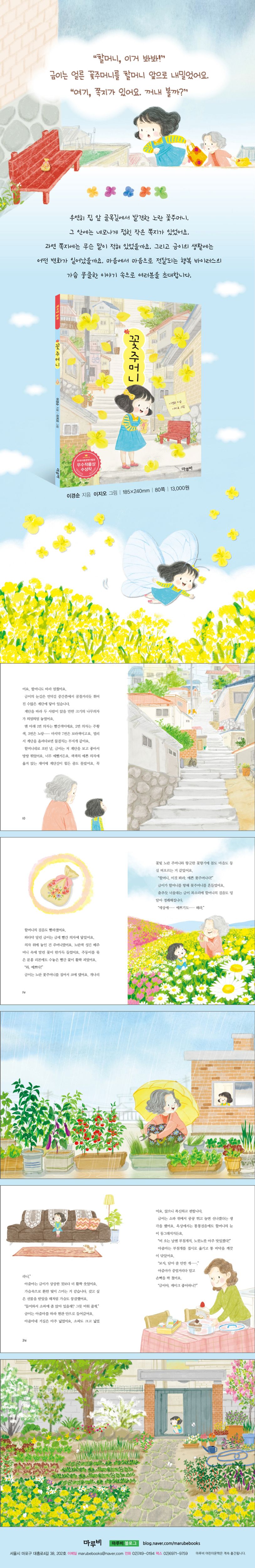 초등 저학년을 위한 책이랑 놀래 7권. 부모님과 떨어져 혼자 할머니와 지내는 1학년 금이는 할머니의 보살핌 속에서도 가족들과 함께 지내는 친구들만 보면 힘이 빠지고 쓸쓸하다. 그러던 어느 날 학교를 마치고 할머니와 함께 집으로 돌아오던 금이는 길가 벤치에서 주인 없는 꽃주머니를 줍게 된다. 할머니와 함께 주머니를 열어 본 금이는 방시레 웃음을 짓게 되는데…. 이 이야기는 꽃주머니에서 비롯된 우리 일상의 작은 행복의 가치를 깨닫게 하는 주제로서 한국아동문학인협회 우수작품상에 선정되기도 한 아름다운 동화이다.