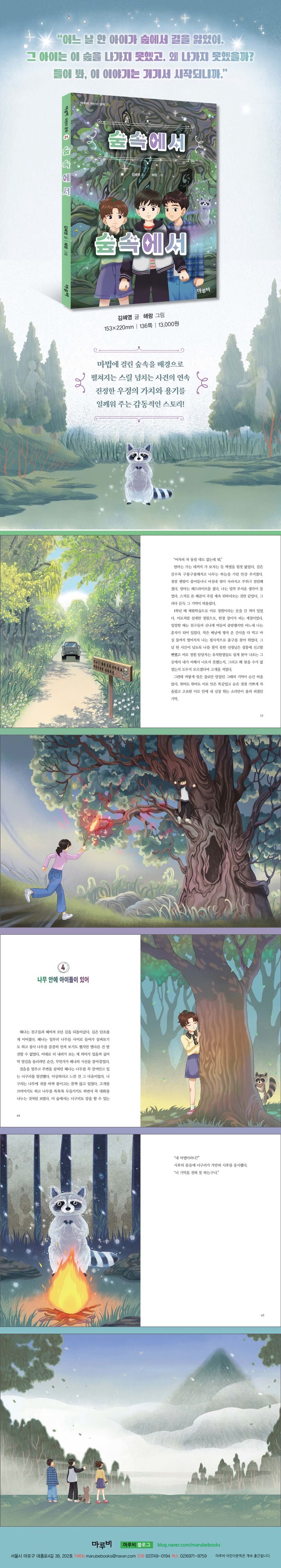 마루비 어린이문학 21번째 작품으로 김혜영 작가의 『숲속에서』가 출간되었다. 그동안 역사, SF 등 다양한 장르에서 작품 활동을 해오고 있는 김혜영 작가의 신작 『숲속에서』는 ‘숲’이라는 그리 낯설지 않은 공간을 배경으로 낯설고 공포스러운 사건의 연속을 다루고 있는 호로적 판타지 동화이다. 세 아이가 ‘숲’을 탈출해 가는 과정에서 또 다른 사건의 핵심 고리로 주인공들의 우정과 반목, 갈등을 등장시킴으로써 단순한 판타지 세계를 넘어서 ‘관계의 중요성’도 함께 깨닫게 해주는 감동적인 이야기로 독자들에게 많은 생각을 던져줄 작품이 될 것이다.