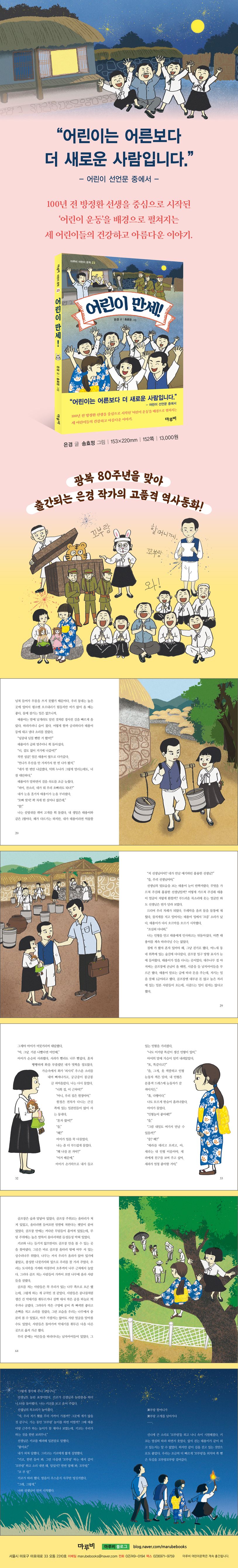 “어린이는어른보다더새로운사람입니다.”-어린이선언문중에서100년전방정환선생을중심으로시작된‘어린이운동’을배경으로그려지는세어린이들의건강하고아름다운이야기.광복80주년을맞아출간되는은경작가의고품격역사동화!그동안역사,SF등다양한장르에서활발한활동과성과를거두고있는은경작가의신작,『어린이만세!』가마루비어린이문학23번째작품으로출간되었다.『어린이만세!』는1920년대일제강점기경성의효창원을중심으로식민지시대를살아가는우리어린이들의슬픔과고통,노동과우정,그리고씩씩한어린이로서의패기를그려낸아름다운역사동화다.무엇보다100년전사진한장에서시작된은경작가의섬세하면서도통찰력깊은역사의식과정제된문장으로풀어낸서사는우리어린이들이특정시대를이해하는데좋은길잡이가되어줄것이다.식민지시대의어린이,근주와태용일본의식민지가된조선의상황은모든면에서열악하기그지없었다.조선은나라를빼앗긴이후1920년대에들어서면서,조선에사는일본인의수가무려조선인의1/3에달했으며식민지의법과제도도일본인들에게유리하게만들어졌다.당연히식민지조선은일본인들에게새로운기회의땅이되었고일본인들은조선땅의1/2을차지하게되었다.조선인들은그만큼의땅을빼앗기고일자리를찾아헤매야만했다.이렇게가족의생계를위해어른들은가족과떨어져타지로일자리를찾아떠나야만했고식민지조선에남겨진어린이들의생활은그만큼외롭고궁핍할수밖에없었다.이이야기의주인공근주와태용은이러한시대적아픔속에서등장하고있다.근주와태용이사는동네는일본이조선의왕실묘역이었던곳을골프장으로변경해이용하던효창원부근이다.근주는부모님없이일본인이운영하는약방점원으로일하는언니와단둘이지낸다.그래서장마철마다지붕에물이새도고쳐줄어른이없다.태용역시아버지가몇년째집을나가소식이없고병든할머니와식모일을하는어머니를위해학교도그만두고물을길러주거나,인근효창원골프장에서무거운가방을메고공치는사람들시중드는일을하며돈을벌며생활한다.“고마워.”태용이가물을벌컥벌컥마시고는다시양철물통을물지게에걸었다.“또물뜨러가?”“응,대추나무집할아버지가가져다달래셔.”“힘들겠다.”“그래도그집거는바로바로해다줘야해.”“왜?또아저씨가일줬어?”“응.내일골프장으로나오래.”“그랬구나.”내가고개를끄덕이자태용이가서둘러나가려했다.-본문19쪽아버지를찾는또다른어린이,키코근주는장마로불어난물구경을하러마을아래넝클내로갔다가우연히떠내러온서양인형을줍게되고이를계기로일본인소녀키코와마주친다.키코는돈을벌러조선으로떠난아빠를만나러왔지만엄마는돌아가시고이모집에서살고있다.그러던중에골프장에서아빠를봤다는말을듣고매일골프장인근공원을배회한다.“난여기에아버지를찾으러왔어.”“여기에아버지가계셔?”“응.아버지가골프를친다는얘기를들었거든.식당에서이모가친구에게하는얘길들었어.골프장은경성에여기밖에없다고했고.그래서방학하자마자이리로와본거야.”키코는이미개썰매를타고아버지를찾으러나선거였다.내가상상으로만하고있던일을키코가하고있다고생각하니몸이떨려왔다.-본문57쪽독립운동을하는아버지를대신해집안의가장노릇을해야만하는태용에게일본인아이키코는반가울리없다.근주가키코와가깝게지내는것도인정할수없는데키코의아버지찾기에함께나선근주가태용은못마땅하기만하다.하지만이익에만함몰된어른들과달리순수한우정과아버지의부재라는공통된아픔을잘알고있는태용도점점키코의처지를불쌍히여기며함께돕게된다.“불쌍한건우리야,이바보야.”잠자코있던태용이가말했다.꼭고구마를먹다막힌것같은목소리였다.“자꾸만바보래!”내가눈을홉뜨자태용이가못박듯말했다.“정말바보니까.나한테일본인아이를도와주라고?우리아버지가왜집을떠났는데!우리엄마가왜일본사람집식모노릇을하고,우리할머니가왜병이났는데.내가학교도다못다니고일하러다니는게다뭣때문인데……!”-본문60쪽하얀셔츠의선생님태용이다니던야학의하얀셔츠차림의선생님은1920년대‘어린이운동’의중심이었던방정환선생의모습으로이작품속에서그려지고있다.외롭고고달팠던태용과근주의뒤에서든든한힘이되어주었던어른으로,선생님은아이들의슬픔을위로하고함께읽고공부하며놀이를만들어함께즐기면서아버지가사라진엄혹한식민지시절의조선어린이들에게용기를잊지않고당당한어린이로서성장해가도록돕는역할을하고있다.“일본에서는뭐하고살았어요?”“공부를했단다.”“무슨공부요?”“우리조선이더밝고씩씩해질공부를했지.”“그럼,이제조선이밝고씩씩해지는거예요?”“그럼,그렇게될게다.”선생님은뭐가좋은지나를보고환히웃었다.선생님이말하는거면확실한걸거다.그렇게생각하니내마음도힘이나고밝아지는것같았다.나도선생님을보고웃었다.-본문91쪽돌아온아버지들,어린이만세!오랫동안헤어져있던근주의아버지가돌아오고근주는비로소안정감을찾게된다.비록아버지가자신을모른척했지만키코는당당하게혼자살아갈것을다짐하고,태용은나라의