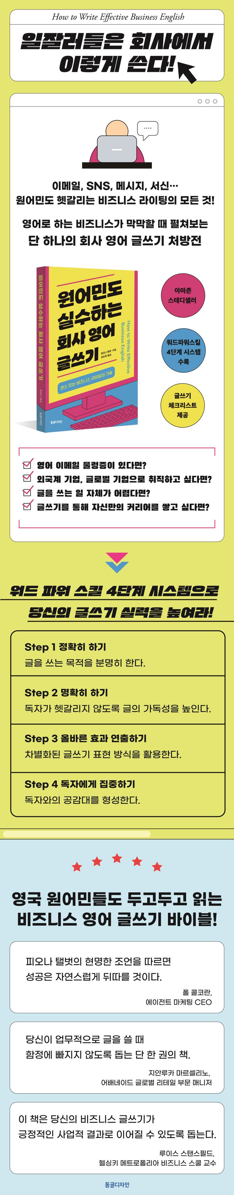 비즈니스 커뮤니케이션 전문가인 저자는 수많은 국제적 기업과 경영 대학에서의 컨설팅 및 워크숍을 진행해온 그간의 경험을 바탕으로 이 책에 주옥같은 영어 글쓰기 실전 노하우들을 쏟아낸다. 비즈니스 글쓰기를 위한 기본적인 생각법부터 필수적으로 알아둬야 할 문법과 구두법까지, 영어 글쓰기의 모든 것을 개괄적으로 이해할 수 있도록 일목요연하게 정리하였다. 또한 저자가 직접 고안한 워드파워스킬 시스템 4단계를 실제로 글을 쓸 때마다 적용해 봄으로써, 의도한 것 그 이상의 결과를 만들어 내는 매력적인 영어 글쓰기 단계까지 더 쉽게 도약할 것이다. 이 책은 글로벌 인재를 꿈꾸는 사람들에게 구체적인 가이드를 제시해 주는 유일무이한 비즈니스 글쓰기 가이드다.