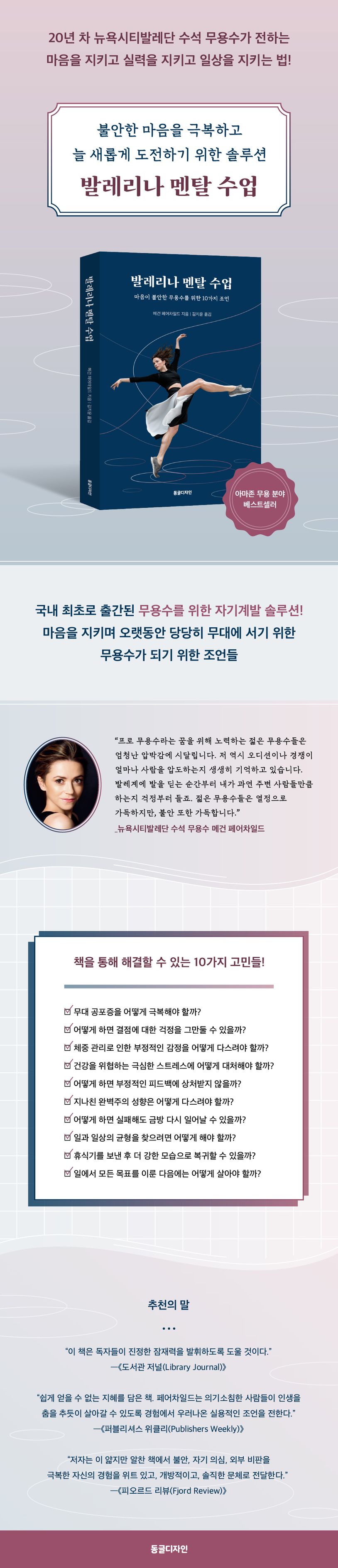 2002년 뉴욕시티발레단에 입단한 이후 3년 만에 수석 무용수가 되어 현재까지 활발하게 활동할 뿐만 아니라, 육아와 학업까지 병행하고 있는 발레리나 메건 페어차일드. 그녀는 어린 나이에 최고의 자리에 올랐다는 부담감과 두려움으로 인해 심한 공황 증세까지 겪었지만, 고군분투 끝에 심리적인 안정을 찾고 일과 일상 모두를 지키는 데 성공했다. 극심한 배역 경쟁과 다이어트, 부상과 은퇴에 대한 두려움, 대중과 평론가의 평가 등 무용수의 멘탈을 위협하는 여러 문제 앞에서 어떻게 마음의 평화를 찾고 균형 잡힌 삶을 살게 되었을까? 신체 부상은 어떻게든 회복하려고 노력하지만, 마음속 부상은 지나치고 마는 많은 무용수를 위해 메건 페어차일드가 나섰다! 『발레리나 멘탈 수업』에는 무용수들이 보편적으로 가지고 있는 여러 심리 문제와 이를 하나씩 해결하고 극복해 온 저자의 경험담이 담겼다. 이는 마음이 불안하거나 고민이 많은 모든 무용수에게 강인하고 건강한 마음을 선물할 것이며, 따뜻한 격려와 응원이 되어줄 것이다.