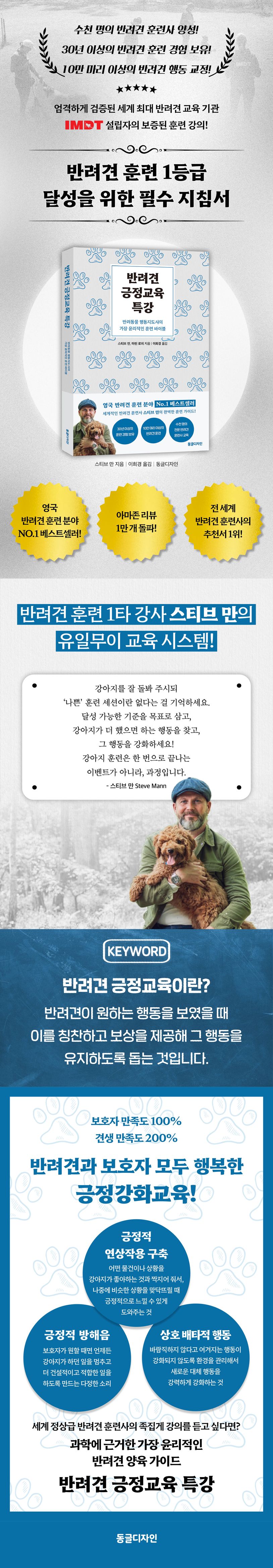또한 긍정교육을 기반으로 훈련 세션을 설계하고 진행하는 방법과 강아지를 양육하기 전에 알아야 할 기본 지식을 총망라했다. 강아지를 입양하는 순간부터 반려견의 행동 심리, 시그널 해석, 행동 교정 성공 사례 등 유용한 정보만을 담아냈고, 저자만의 유머를 더해 지루할 틈 없이 읽을 수 있다. 전문 지식이 없는 이도 단번에 이해하고 훈련을 실행할 수 있도록 쉽게 쓰였기 때문에 실생활에서 두고두고 활용할 수 있는 알찬 실용서이다.