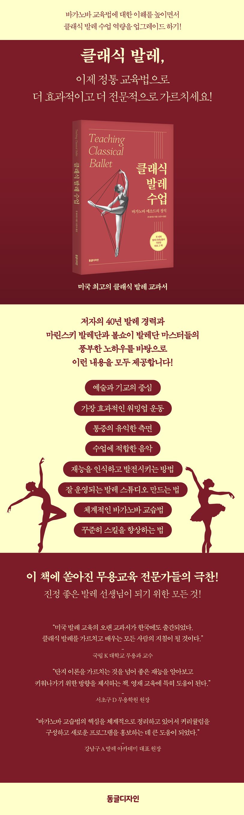 발레를 오랫동안 제대로 가르치고자 한다면 어떤 수업을 기획해야 할까. 어린이와 성인의 수업 방법은 무엇이 다를까. 가장 완벽한 발레 수업을 위한 모든 질문에 이 책이 필요할 것이다. 이 책은 클래식 발레를 배우려는 사람들을 어떻게 교육하고 가르쳐야 하는지, 발레를 배우려면 어떤 교사에게 배워야 하는지, 클래식 발레의 이해와 교육 방법 그리고 발레 스튜디오 운영법을 소개한다. 무엇보다 효과적인 바가노바 기반 발레 수업 방법에 집중한 책으로 선생님을 위한 훌륭한 지침서가 될 것이다. 클래식 발레의 기본 용어부터 정확한 동작과 자세를 소개한 이미지, 발레교습소가 갖추어야 할 주요 인테리어 및 수업 환경, 교사의 역량과 지식의 기초가 되는 교수법의 소개까지 탄탄한 발레 수업을 위해 반드시 알아야 할 필수 사항들을 현장감 있게 담은 것이 특징이다. 어느 분야든 학생들이 달성하는 탁월함은 교사의 능력과 헌신으로 좌우된다. 발레라는 예술을 더욱 효과적으로 가르치려는 교사들에게 이 책이 분명 큰 도움이 될 것이다.