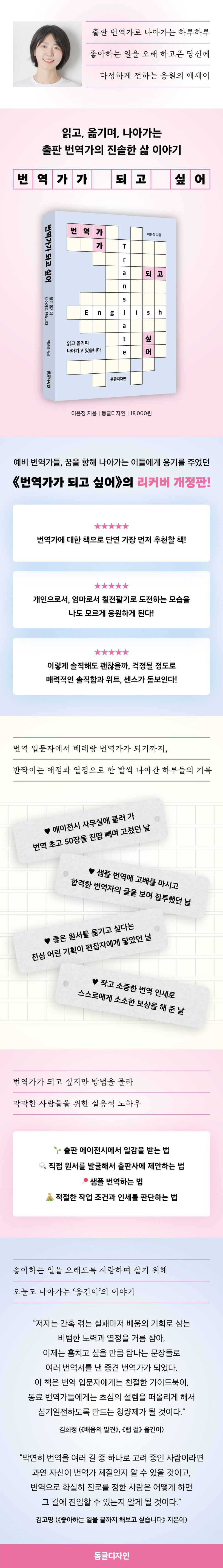 많은 예비 번역가들, 그리고 꿈을 향해 조금 더 나아가고자 하는 이들에게 용기와 힘을 주었던 《번역가가 되고 싶어》가 새 얼굴로 독자들을 다시 만난다. 초판을 펴냈을 당시와 마찬가지로 지금도 번역가라는 업에 대한 저자의 열정은 변함없이 뜨겁지만, 시간과 경력이 쌓이며 새로이 전하고 싶은 이야기들이 생겼다. 이번 개정판에는 그간 더 무르익은 경험과 생각들이 가미되어 책의 깊이를 더한다.
