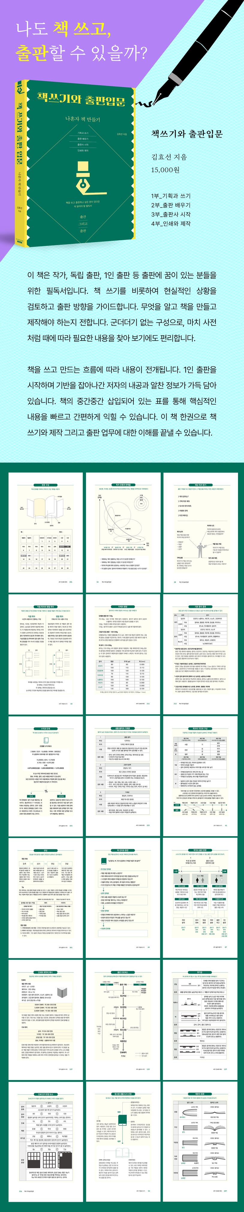 [1부, 기획과 쓰기 / 2부, 출판 배우기 / 3부, 출판사 시작 / 4부, 인쇄와 제작]으로 구성된 장은 책을 쓰고 만드는 일련의 흐름에 따라 전개됩니다. 1인 출판을 시작하며 기반을 잡아나간 저자의 내공과 알찬 정보가 가득 담아 있습니다. 책의 중간중간 삽입되어 있는 표를 통해 핵심적인 내용을 빠르고 간편하게 익힐 수 있습니다. 이 책 한권으로 책 쓰기와 제작 그리고 출판 업무에 대한 이해를 끝낼 수 있습니다.