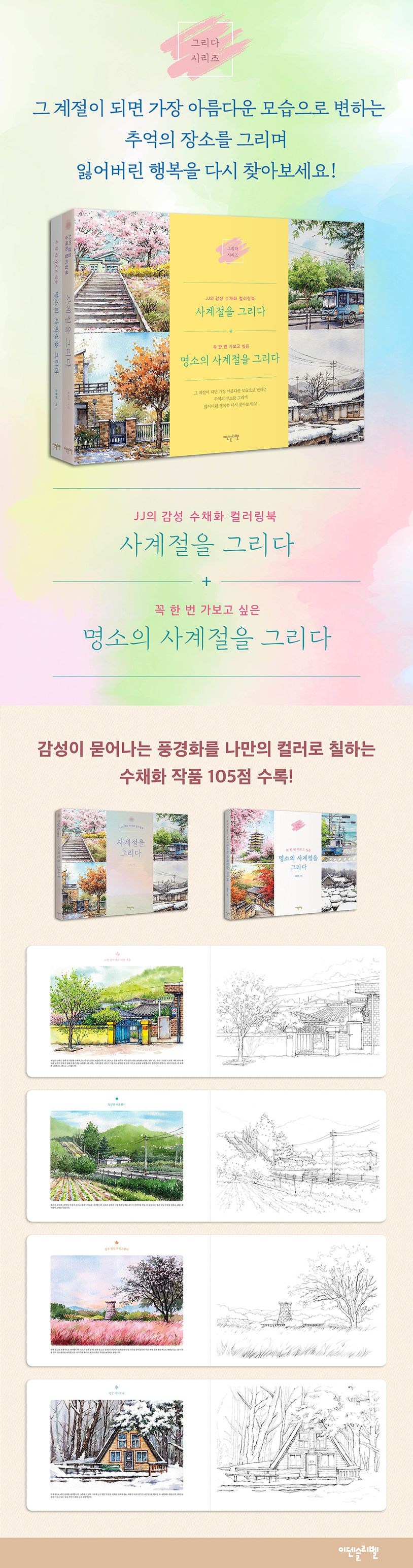 어반스케치를 사랑하는 JJ 가 105곳의 대한민국 핫플레이스를 수채화로 담았다! 인스타그램에서 감성적인 수채화 그림으로 7만 팔로워를 가진 인플루언서이자 베스트셀러 작가로 큰 사랑을 받고 있는 JJ가《사계절을 그리다》에 이어《명소의 사계절을 그리다》를 출간했다.