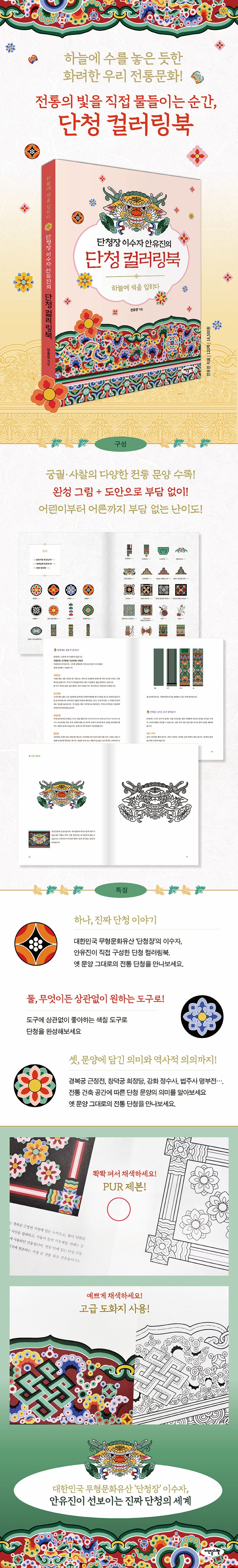 전통을 잇는 전문가의 손길로 탄생한 이 컬러링북은, 단청을 처음 접하는 이들에게도, 전통문화의 아름다움을 다시 만나고 싶은 이들에게도 잊지 못할 경험을 선사할 것이다.