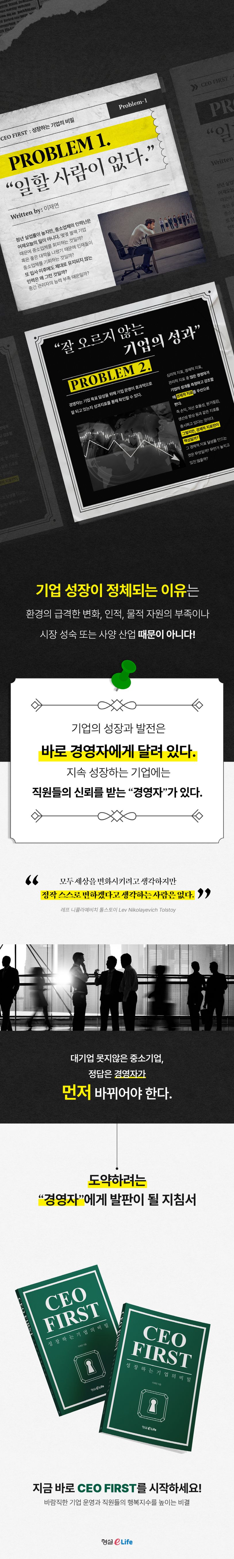 중소기업이 성장하기 위한 조건은 경영자의 마인드에 달려있다. 직원들이 일하고 싶은 회사로 만들려면 경영자가 나서야 한다. 〈성장하는 기업의 비밀: CEO FIRST〉는 경영자가 알아야 할 것, 직원을 성장시키는 법, ‘리더’가 되는 방향을 제시해 주는 책이다. 경영자가 어떻게 기업을 만들어 나갈지 끊임없이 고민해야만 기업이 건강하게 장수할 수 있다. 기업을 어떻게 성장시킬지 선택은 자유지만, 선택의 결과는 기업의 수명을 결정하게 된다.