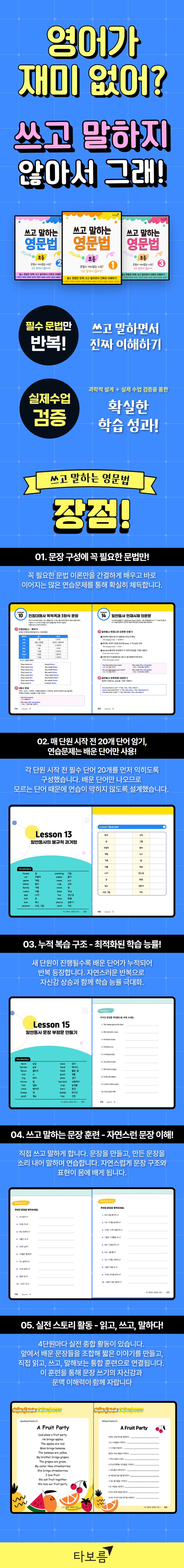 『쓰고 말하는 영문법』은 오랜 기간 다양한 학생들과 실제 수업을 통해 검증된 교재입니다. 필수 문법을 간결하게 제시하고, 풍부한 연습문제를 통해 쓰고 말하며 이해가 완전히 될 때까지 반복하도록 구성되었습니다. 과학적으로 설계되어 반복 학습이 지루하지 않으며, 학습자는 높은 효율과 동기부여를 얻어 지속 가능한 영어 학습을 이어갈 수 있습니다.