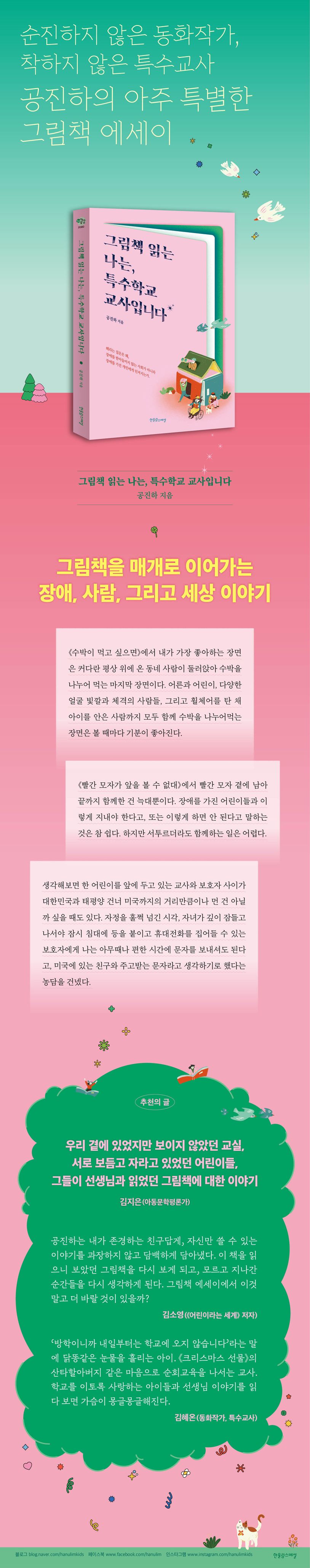 그런 그가 “그림책을 사랑하는 독자로, 어린이의 눈높이를 맞춰줄 수 있는 어른으로, 어린이책 작가로, 그리고 무엇보다 특수학교 교사로” 자신만이 쓸 수 있는 그림책 교직 에세이를 들려준다.