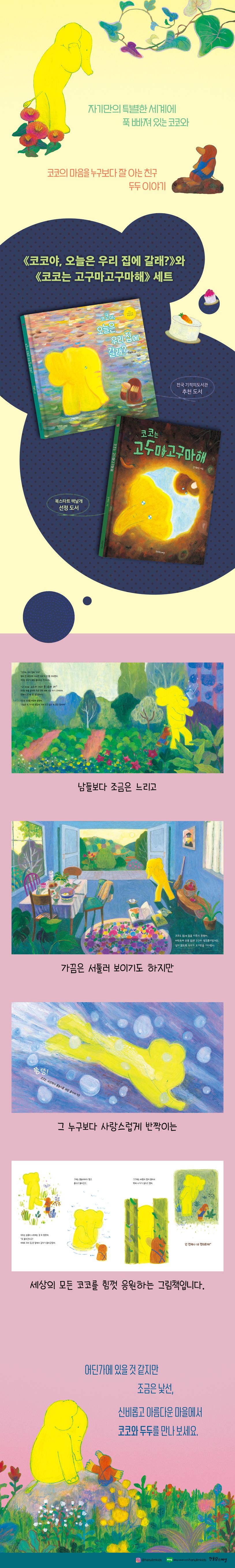 자기만의 세계에 빠져 있는 코코와 그런 코코를 누구보다 잘 아는 친구 두두 이야기, 《코코야, 오늘은 우리 집에 갈래?》와 《코코는 고구마고구마해》를 세트로 만나 보세요. 남들보다 조금 느리고 서툴지만 누구보다 사랑스러운, 세상의 모든 '코코'를 응원하는 그림책입니다.