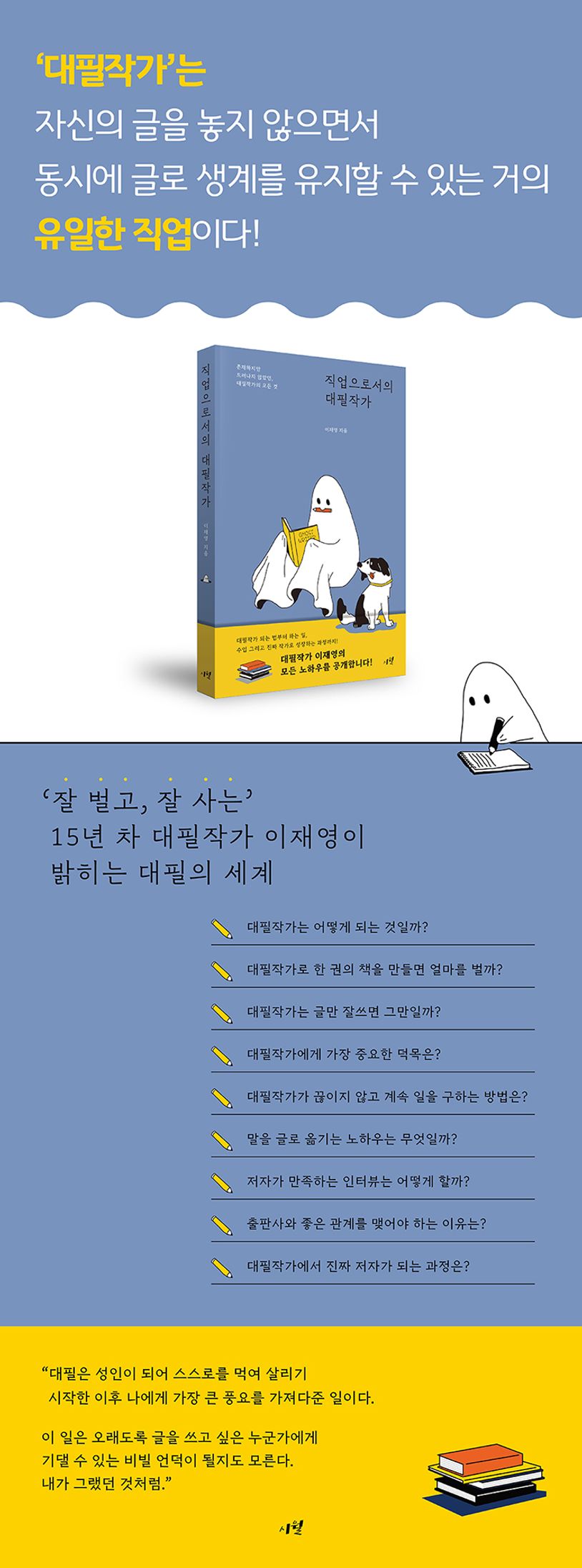 ‘대필작가’는 누군가에게 생소하겠지만, 출판계의 생리를 조금이라도 알고 있는 이들에게는 매우 친숙하고 익숙한 직업이다. 누구나 이름을 알고 있는 유명인, 인플루언서, 연예인, 정치인들의 책 중 그들이 직접 원고를 쓰는 경우는 30%를 채 넘지 않을 것이다. 대부분은 대필작가를 통해 원고가 만들어지기 마련이다. 이렇게 출판의 한 축을 담당하는 직업임에도 대필작가는 그 비중에 비해 이상하리만치 알려지지 않았다. 어떻게 될 수 있는지, 얼마나 버는지, 어떻게 일을 구하는지, 어떤 일을 하는지 등등 많은 부분이 베일에 싸여 있다. 그래서 대필작가는 그간 존재하는 그림자이자, 숨 쉬는 유령에 가까웠다.