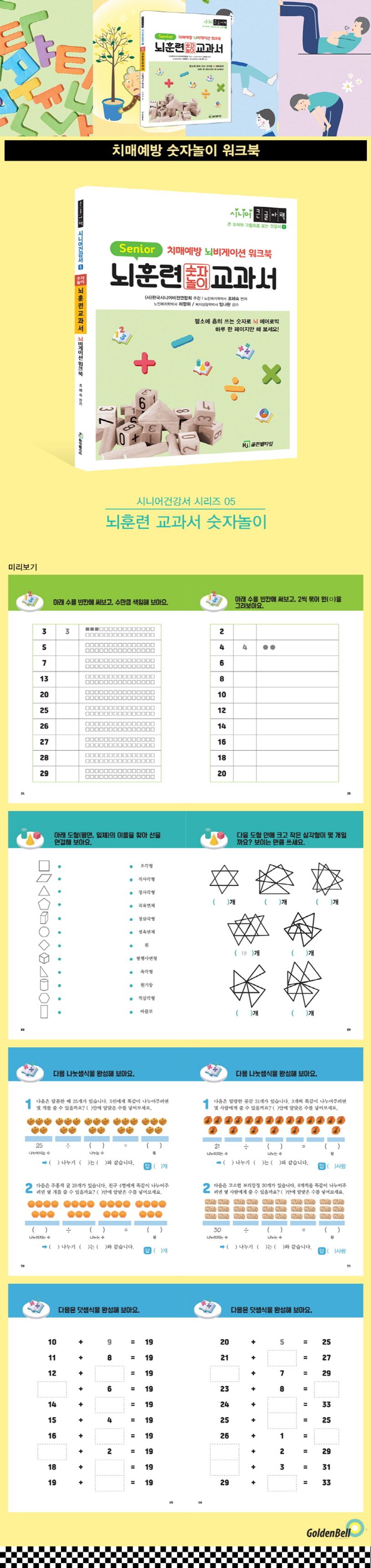 따라서 건강한 노후를 유지하기 위한 하나의 전력으로 「언어놀이」편에 이어 일상 속 숫자를 활용한 뇌훈련을 제시하고자 본서를 집필했다. 어르신들께서 큰 글자로 된 이 책을 쉽게 접근할 수 있고, 지속적인 수학적 인지활동을 통해 건강한 뇌훈련 효과가 있기를 기대해 본다.