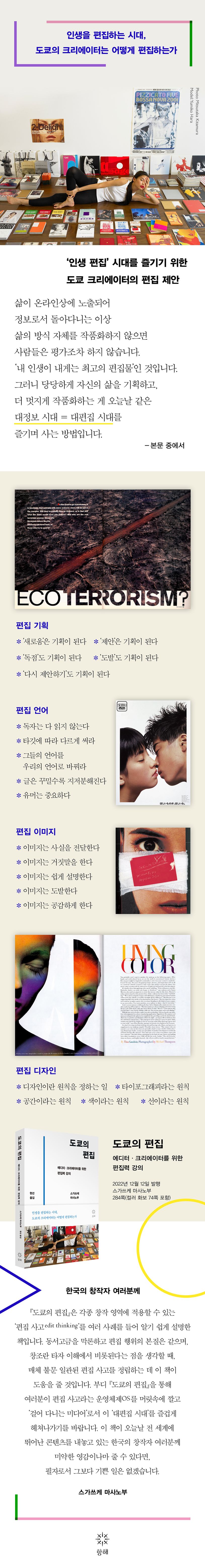 저자가 말하는 편집론은 간명합니다. 편집이란 ‘기획을 세우고, 사람을 모아서, 결과물을 만들어내는 활동’이며, 그런 편집의 3요소는 언어, 이미지, 디자인입니다. 저자에게 훌륭한 편집이란 이 3요소가 조화를 이룬 결과물이며『도쿄의 편집』에서는 이 3요소를 어떻게 다룰 것인지를 말합니다. ‘기획’의 방법론에는 어떤 것이 있는지, 편집적으로 유효한 ‘언어’란 무엇인지, 보는 사람을 촉발시키는 ‘이미지’란 어떤 것인지, 이 모든 것을 아우르는 ‘디자인’의 역할은 무엇인지 말하는, 이 도쿄 편집자의 노하우와 감각을 하나하나 익혀서 누군가는 ‘서울의 편집’을 만들어냈으면 좋겠습니다. 그런 마음으로 『도쿄의 편집』을 소개합니다.