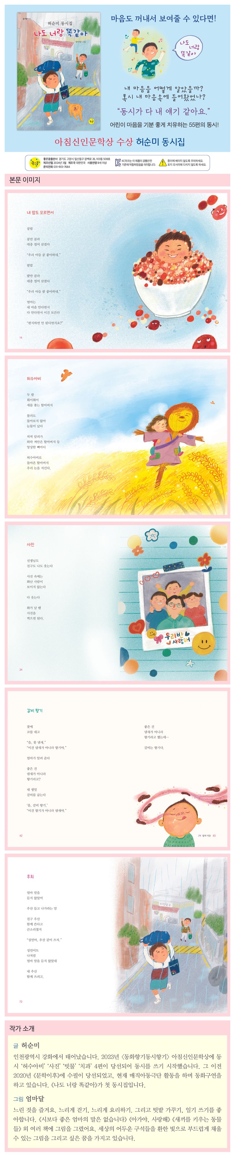 어린이 세계에서 볼 수 있는 갖가지 일상과 누구나 한 번쯤 경험한 일을 소재로 삼았다. 버스에서 자리를 양보할까 말까 망설이다 편한 몸 대신 불편한 마음을 얻은 일. 용기가 없어 반장 선거에 손을 들지 못했던 일. 속마음과 겉마음이 너무 달라서 당황했던 순간. 기쁘고 슬프고 아프고 미안한 것들. 어린이의 내적ㆍ외적인 면을 소홀히 넘기지 않고 넓고 깊게 살피고 있다. 작가는 동시를 통해서 서로 다른 것 같지만 “나도 너랑 똑같아.” 라고 위로의 말을 건넨다.