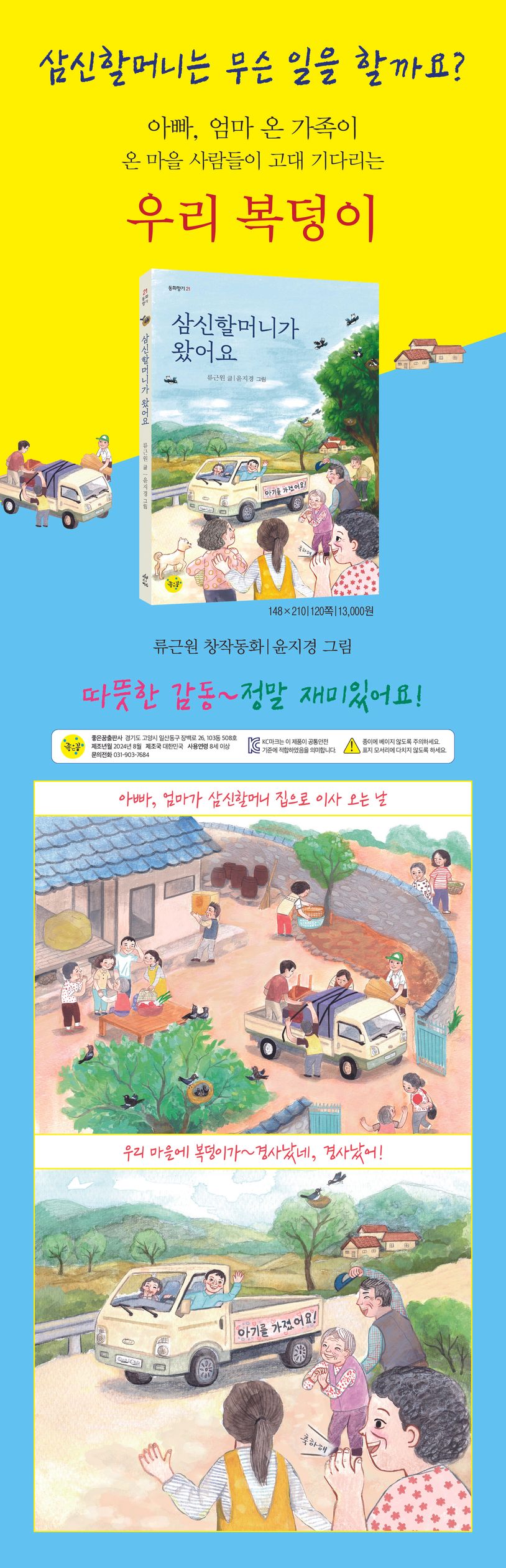 제호 동화인 〈삼신할머니가 왔어요〉는 아기를 낳지 않는 나라, 인구 소멸로 100년 후 국가 존립마저 위태로운 안타까운 현실을 생각하며 민담 속의 ‘점지 할머니’인 삼신할머니를 소재로 하였다. 한 번쯤 들어본 ‘삼신할머니’가 무슨 일을 하는지? 어린이들에게 흥미롭게 다가가는 소재이다.